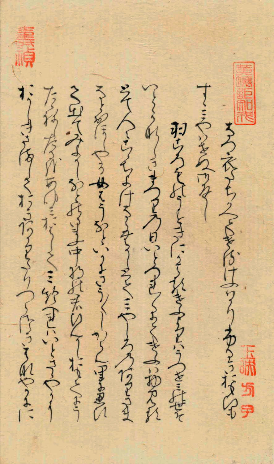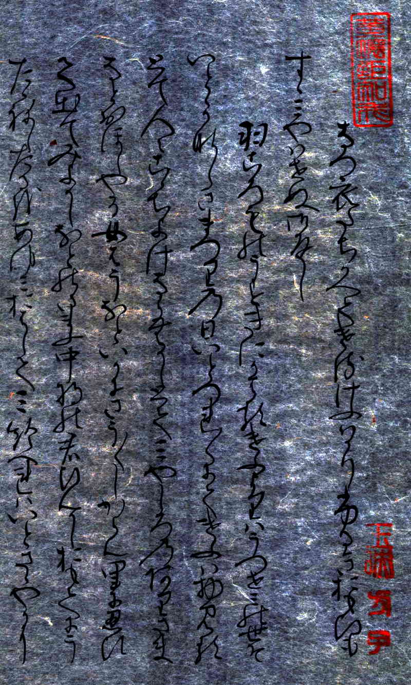 原本自筆上部には、自筆上部には、「黄壌知我」《黄壌(おうじょう)(なん)ぞ我を知らむ》という篆書印が押捺されている。この漢詩は白楽天が友人の元槇と深い友情を記したもので白楽天の有名な漢詩です。紫式部がこの原詩に親しんでいたことがわかる。