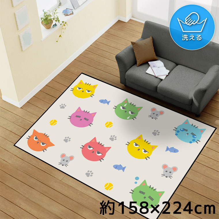 ラグ 洗える 3畳 約158×224cm カーペット イラスト リビング 寝室 転写プリント イラスト TEN176-E ねこ カラフル ネズミ アニマル 收藏