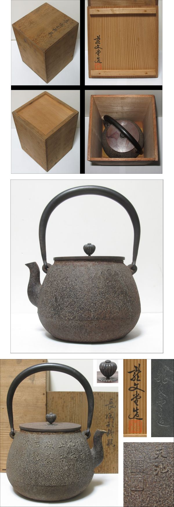 龍文堂造 共箱 純銀摘 斑紫銅蓋 漢詩 天池 花 白肌 長閑形鉄瓶 在銘[身在銘/光玉堂造/金寿堂 雨宮/安之介/小振/忠三郎/忠兵衛/煎茶道具銀摘 收藏