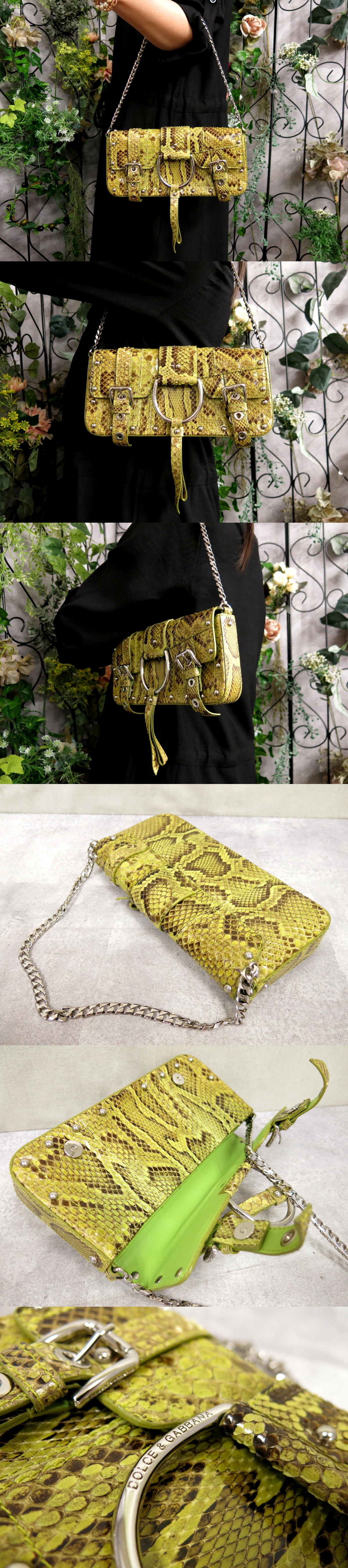 ●超美品●ドルチェ&ガッバーナ●フラップ●パイソン 本 ヘビ 革●チェーン ショルダー バッグ●ライトグリーン ブラウン●SV金具●Js57121 收藏