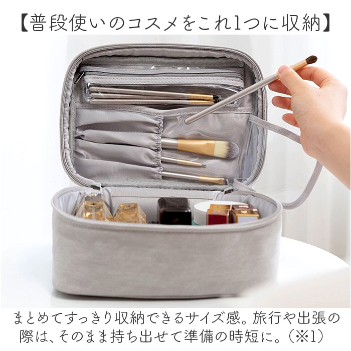 | 商品説明 | ・・【メイク道具をざっくりひとまとめ】 ・デイリー使いも旅行などへの持ち歩きもOK。収納力もあって万能な「化粧ポーチ」。 ・【普段使いのコスメをこれ1つに収納】 ・まとめてすっきり収納できるサイズ感。旅行や出張の際は、そのまま持ち出せて準備の時短に。 ・(※1)上部に持ち手付きです。 ・【ガバっと開いて取り出しラクラク】 ・ダブルファスナーで左右どちらからも180度オープン。中身を見つけやすく出し入れスムーズ◎ ・【色んなサイズのコスメを収納】 ・安定感のあるボックス型。ちょこっと高さのあるパウダーなども収まるつくり。 ・【ブラシなどのツールもすっきり】 ・フタ裏のポケットにはブラシ類をIN。汚れをガードするクリアポケット&カバー仕様。 ・【中身を守るクッション性】 ・本体と裏地の間に、ソフトクッションを内蔵。収納物を衝撃からガード。 ・【水回りでも慌てない撥水性をプラス】 ・汚れや水滴をサッと弾く、撥水加工済み。お手入れも拭き取るだけ。 ・(※2)完全防水仕様ではありません。 ・【取り外しもできる便利なポーチ】 ・常備薬やサニタリーグッズをまとめておけるファスナーポーチ。面ファスナーでカンタン着脱。 ・【長く愛用できるシンプルデザイン】 ・しっとりとした生地感に、装飾を省いたワンカラー仕上げ。年代問わず使えるポーチ。 ・【ポケット仕様】 ・内側フタ裏:ファスナー式クリアポケット×1、ギャザーホルダー×4(背面クリア仕様&カバー付き) |