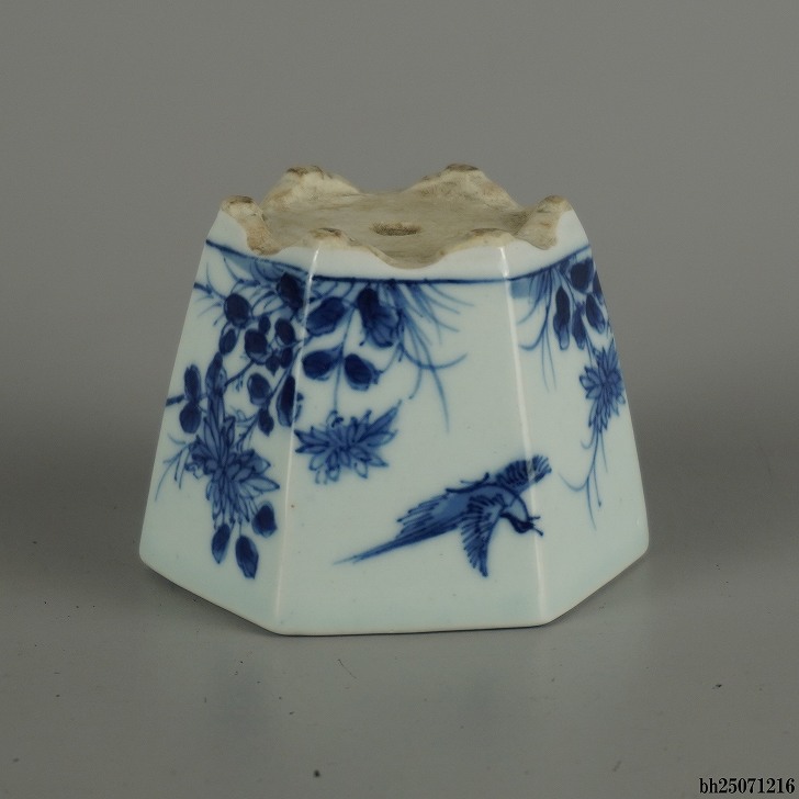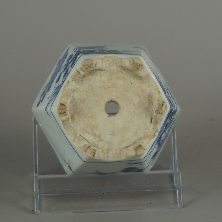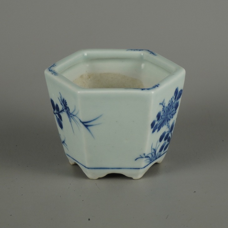 【中古】盆栽鉢 瀬戸焼 落款なし 小鉢 長辺 約 7.3cm 六角鉢 青絵 鳥 花 野花 植物 箱付 布付 鑑賞 観賞用 現品 中古鉢 收藏