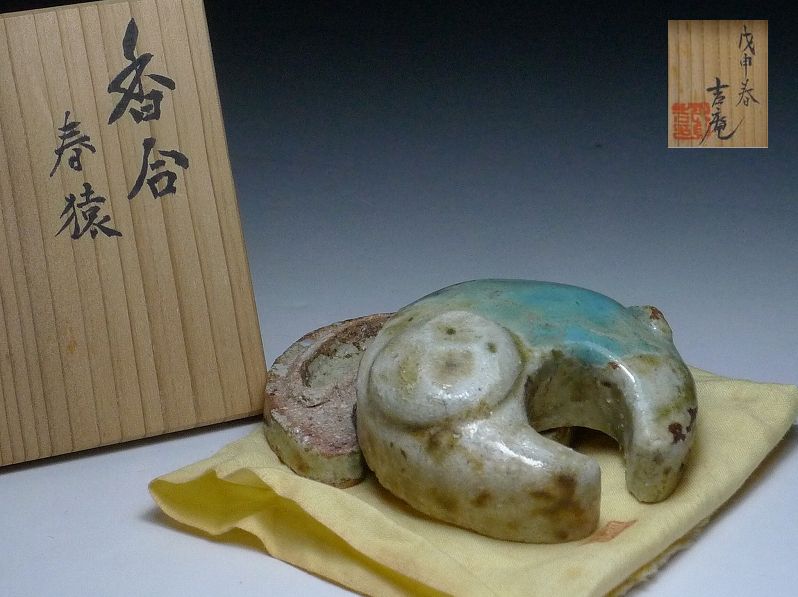 60MK156★戊申春 吉庵造・春猿 香合・共箱 共布付き・干支・茶道具・伝統工芸・古美術 收藏