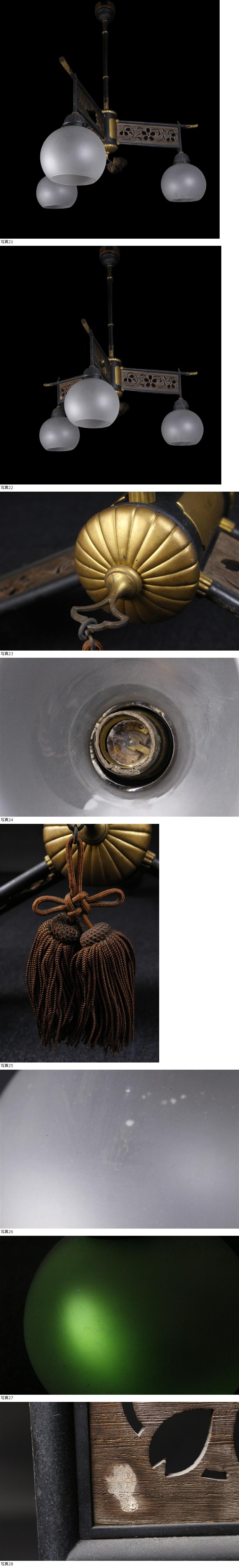 26010501* * * 商品詳細 * * * ここでしか出逢うことのできない唯一の美をご紹介させて頂きます。 大正ロマンをご堪能いただける三灯照明のご紹介です。 電笠は曲線が美しいシンプルな意匠で 木には可憐な桜文の透かし彫りが施され、 木製のシーリングカバーや菊文など作成当時の空気感が伝わってきます。 紫外線で妖しく光るウランガラスも使用されており、 精緻な彫金細工など随所に職人技が光る逸品でございます。 和洋折衷の意匠は大正ロマンを演出する逸品を この機会に是非ご愛蔵ください。 ■商品内容/照明 ※電球はございません。 ■サイズ/横72cm×高92cm×奥行66㎝ ■状態/スレ、傷、経年による傷み、錆び、 木の透かしに直し、割れ、汚れがございます。 ※動作は不明です。 ※写真にてご確認、ご了承の上ご入札下さい。 * * * 支払詳細 * * * !かんたん決済 * * * 発送詳細 * * * 入金確認後3営業日以内に発送致します。 ※直接引き取りも可能です。 60~160サイズにつきましては 佐川急便、ゆうパックのどちらかで発送いたします。 ゆうパック発送の場合、弊社の発送日から追跡サービスに問合せ番号が反映されるまで 約1日ほどお時間がかかりますのでご了承下さい。 * * * 注意事項 * * * 運送中の破損があった場合は速やかに当社までご連絡下さい。 保険を利用するのに受取連絡後に運送会社による現場での破損状況確認が必要となります。 勝手に返送されますと保険の適用外となりますのでご注意ください。 * * * * * * お問い合わせ:082-236-8669 |