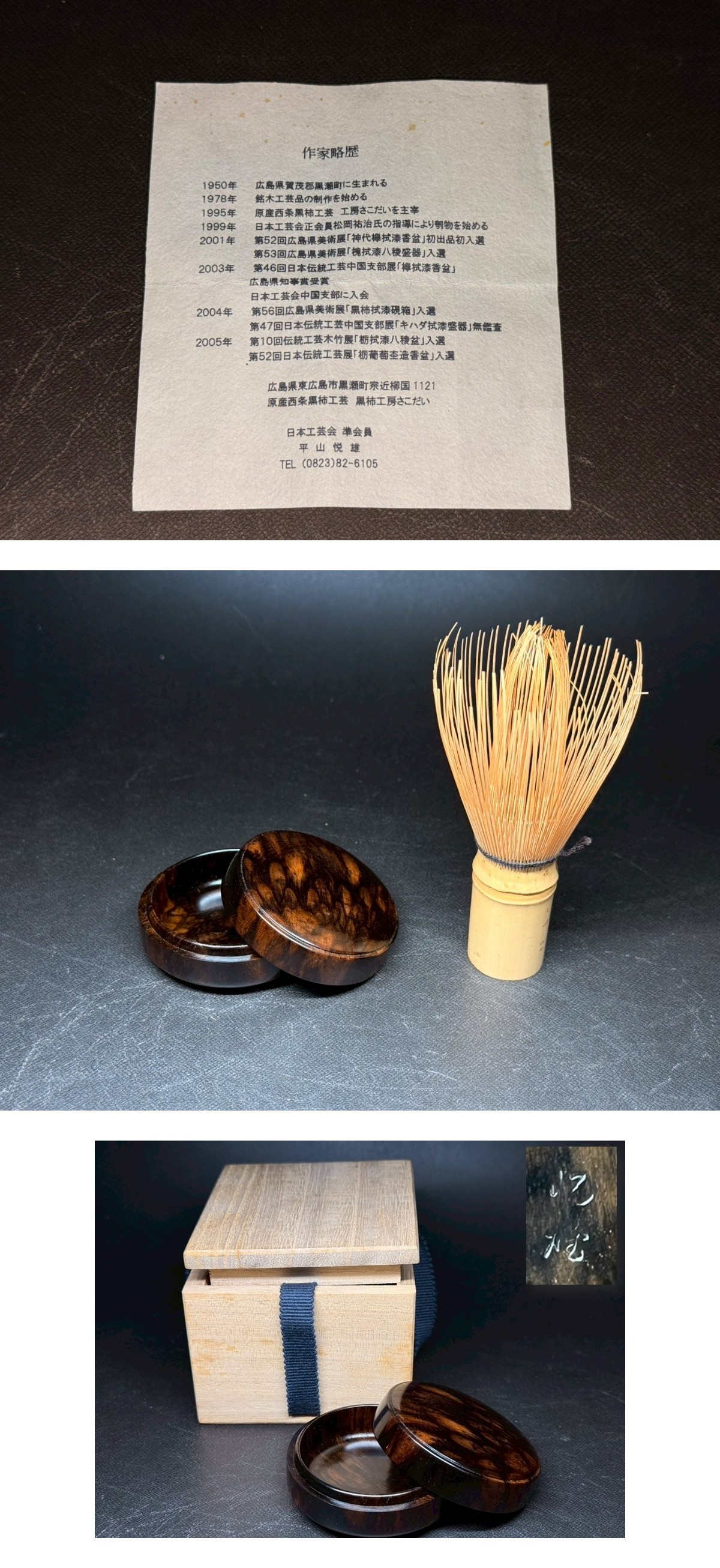 【極上品】黒柿 孔雀杢 平山悦雄 作 拭漆 香合 共箱 作家略歴付 茶道具 希少 銘木 工芸品 漆芸 伝統工芸 日本工芸会 骨董 時代物 收藏