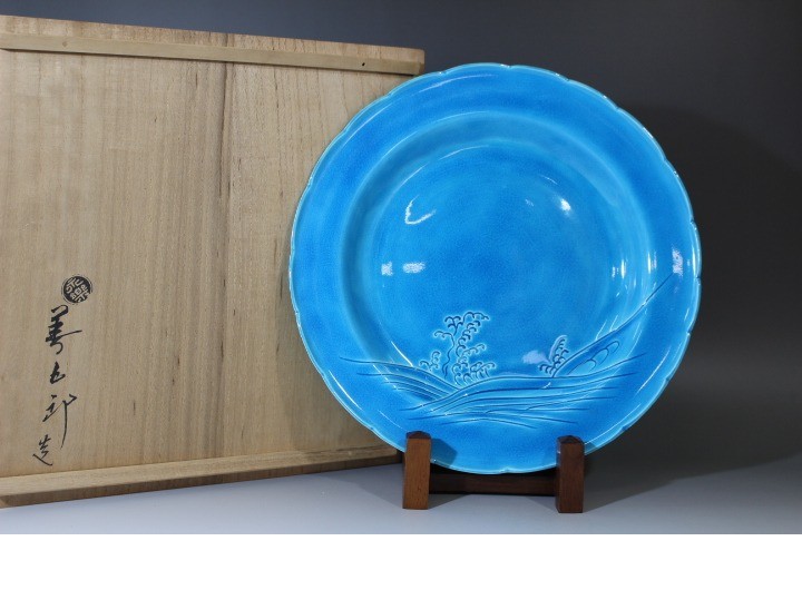 f625 技工名品 十六代 永楽善五郎 (即全) 交趾 波文 輪花 皿 共箱 横26cm 交趾焼 煎茶道具 本物保証 收藏