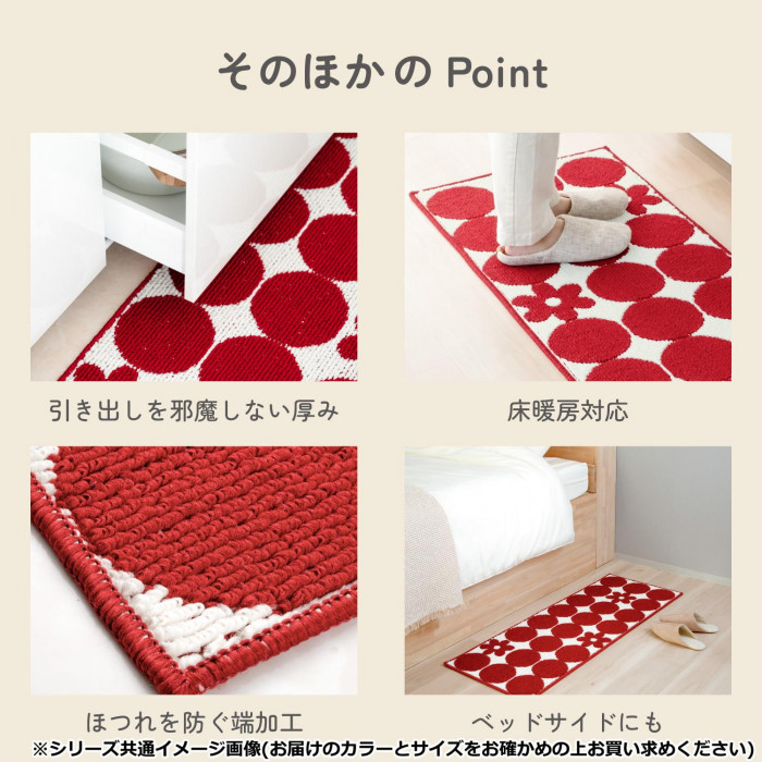 | しっかりとした踏み心地のあるキッチンマットです。掃除機をかけてもズレにくい特殊加工。すべり止め加工をしているので、ずれストレス解消!耐久性があり洗濯にも強いTPR素材です。乾燥性に優れたスジ塗り加工。床暖房に対応しています。 |