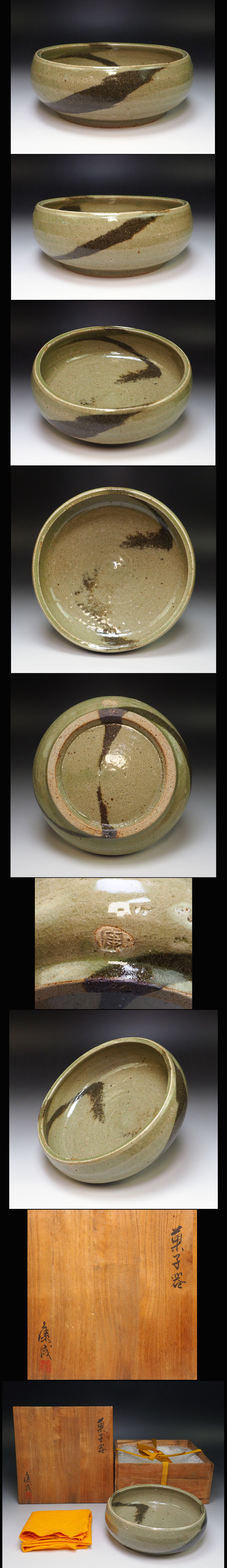 ![]() 練上手の人間国宝、松井康成の練上鉢型の「菓子器」です。 作品に印銘サインがあります。 サイズ:約 径 18cm 高 6.6cm 共箱・布付 作品状態:外傷キズはなく美品です。(目視確認です。) こちらの作品は真作保証の安心頂ける作品であることをお約束いたします。 不明な点は、入札前に質問等でご確認下さい。 松井康成 昭和2年(1927)~平成15年(2003) 重要無形文化財「練上手」保持者(平成5年認定) 長野県に生まれる。明治大学文学部を卒業後、笠間市の古刹月崇寺の住職を継ぎ、昭和35年境内に築窯し、広く中国古陶磁の技法を研究した後、練上に絞った作陶活動を展開させていった。練上は、色や濃淡の異なる土を組み合わせていくことによって様々な文様を表す技法であるが、性質の異なる二種類以上の陶土を用いるため、土の収縮率の違いなどから乾燥や焼成の段階で割れることも多く、高度な技術を要する。松井は、練上で用いる色土の収縮率を同じにするための研究を重ね、練上技法を様々に応用して次々と独自の手法を発表し、陶芸界に新生面を切り拓いた。 | |||