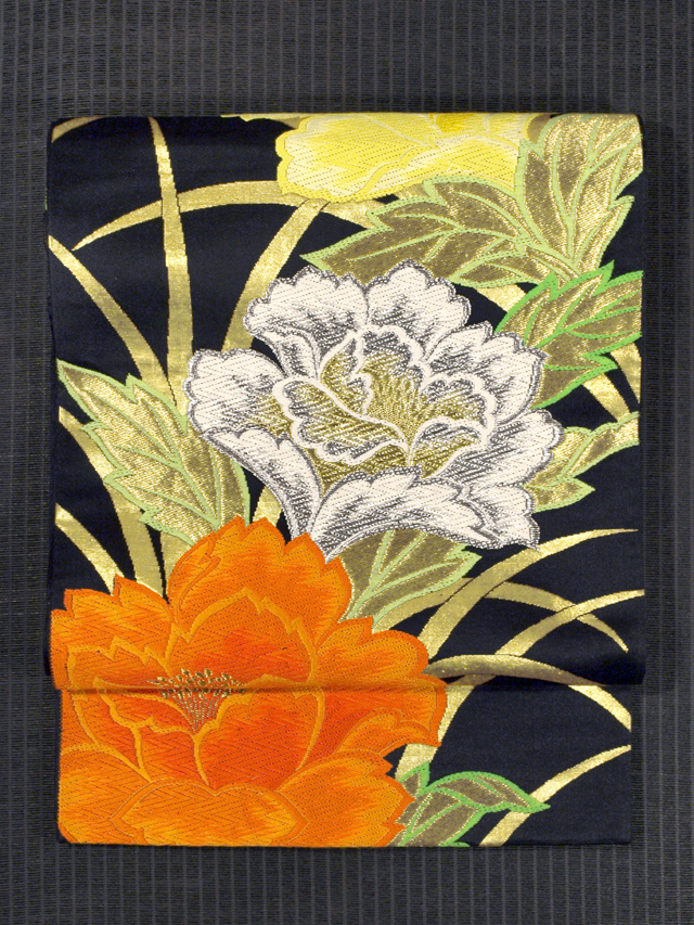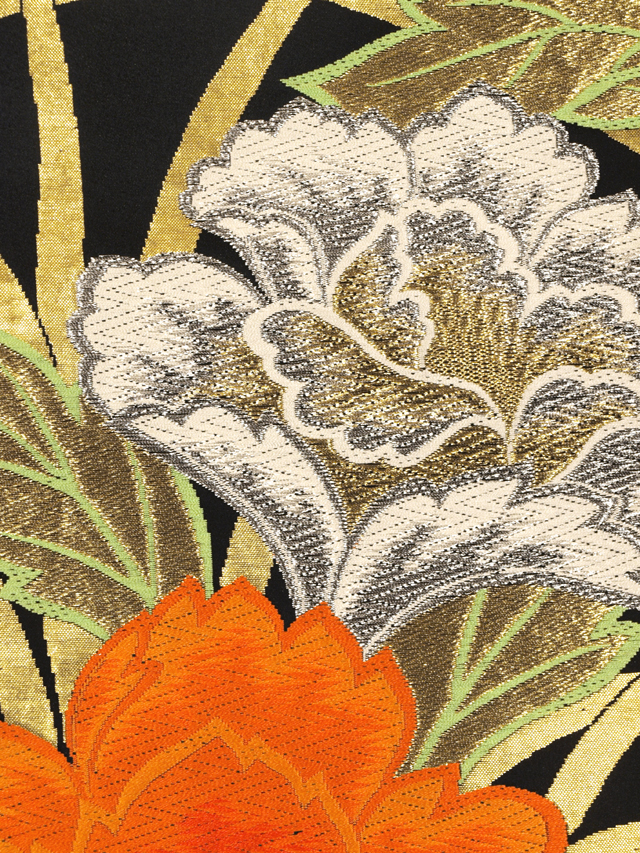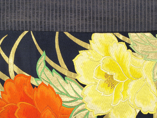 黒色の地に、牡丹(ぼたん)の文様が織り込まれている、西陣織の緞子(どんす)の袋帯です。 アンティークに近いお品ですが、シックな地色に華やかなお色目が映え、現代にも通用する美しさを感じさせる意匠です。緞子のどっしりとした織りですが、帯芯が入れられていないお仕立てになっているので、軽い締め心地になっています。 ユーズド品で、ごくうっすらとした前の折り跡と結びジワがあるほか、胴回りの内側に色糸の織りのこまかなゆるみが 2、3 か所ありますが、とくに気になるようなものではありません。目につくしみやよごれ、褪色などのダメージもなく、全体的にきれいな状態です。 |