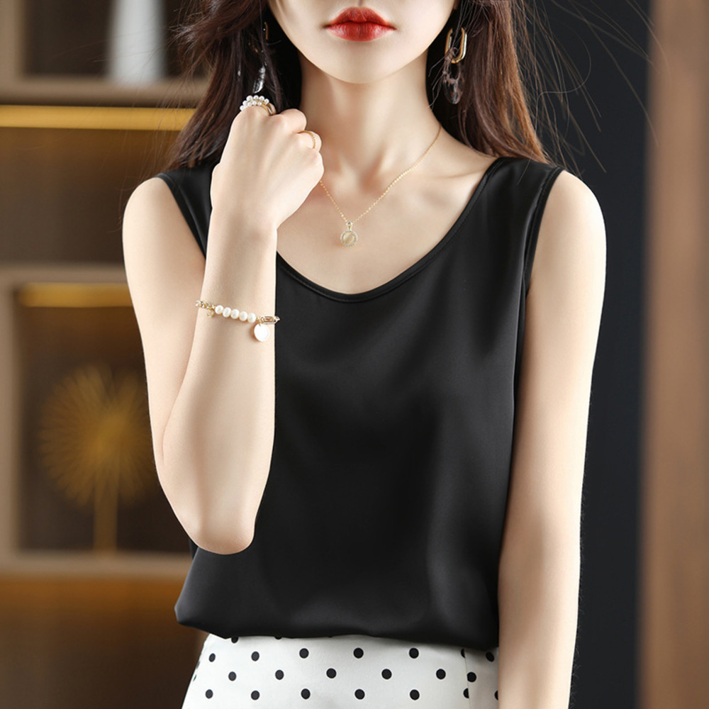 ☆ ブラック ☆ XL ☆ ノースリーブタンクトップ シャツブラウス シルク光沢 スーツ インナー ブラウス ノースリーブ ノースリーブブラウス 收藏