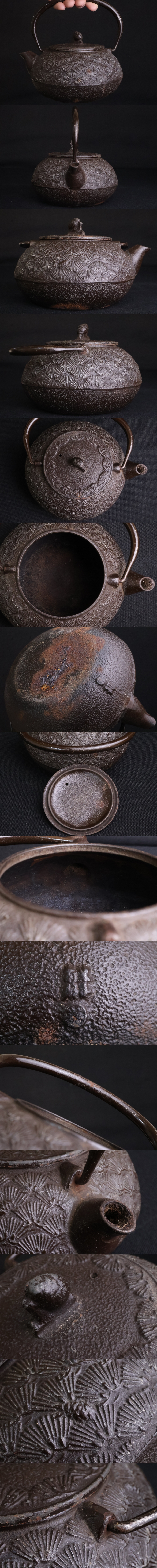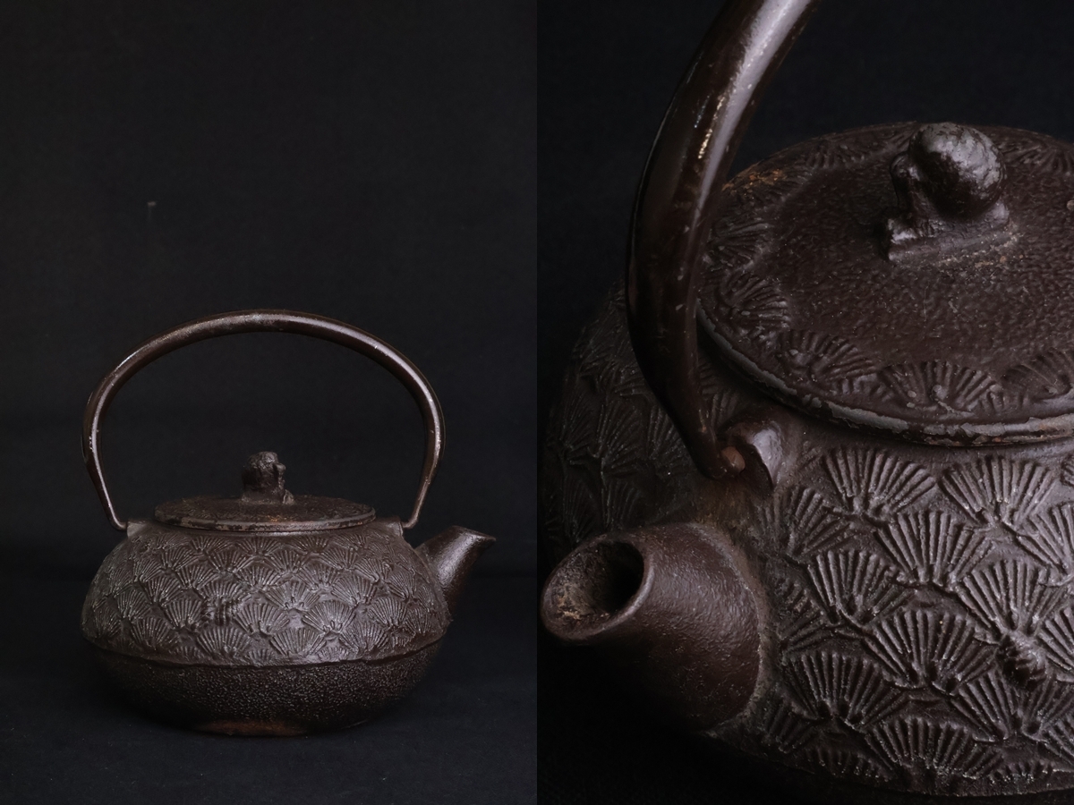 TB526南部鉄器 鉄瓶 約996g◇在銘/丸善/松実摘み/松葉地紋/湯沸/薬缶/茶瓶/茶釜/鉄壺/茶道具/工芸/時代/骨董/古美術/古道具タグボート 收藏