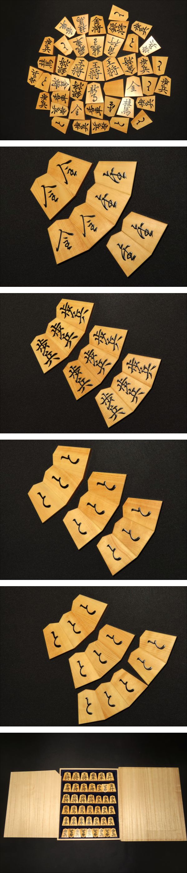 木地は御蔵島黄楊柾目。少し甘いですがタイトルは「赤柾」と謳わせていただきました。ご検討の際は写真でご判断をお願いいたします。全ての駒の表裏をUPいたしましたので是非ご覧ください。