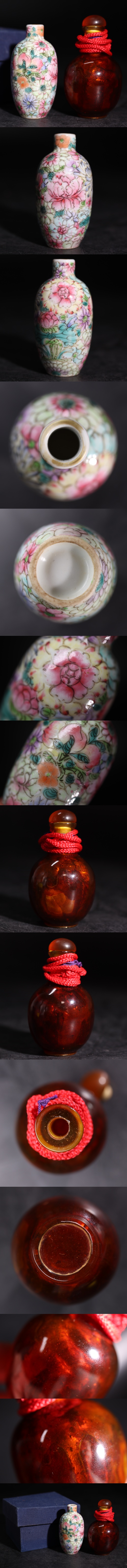 | 時代 色絵 草花紋 など 鼻煙壺 二点 箱付 / 中国美術 粉彩 飴釉 検索: 乾隆ガラス .G3534 |