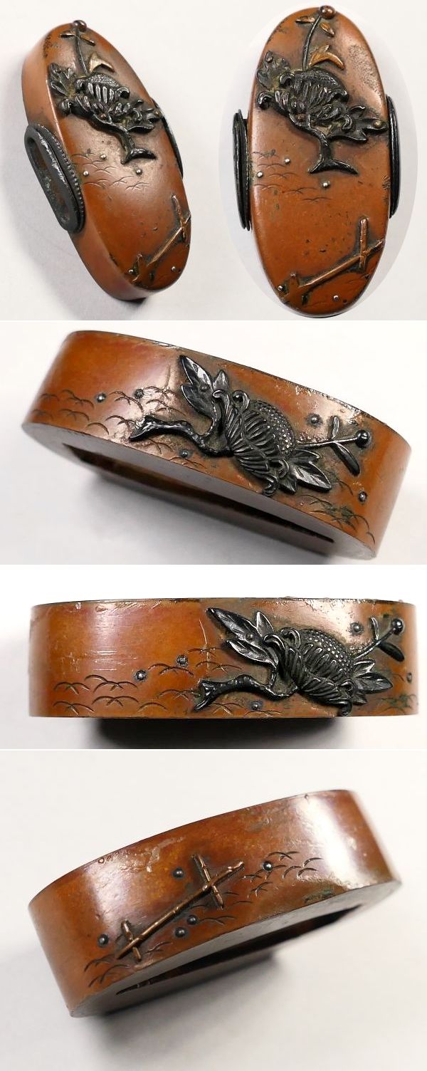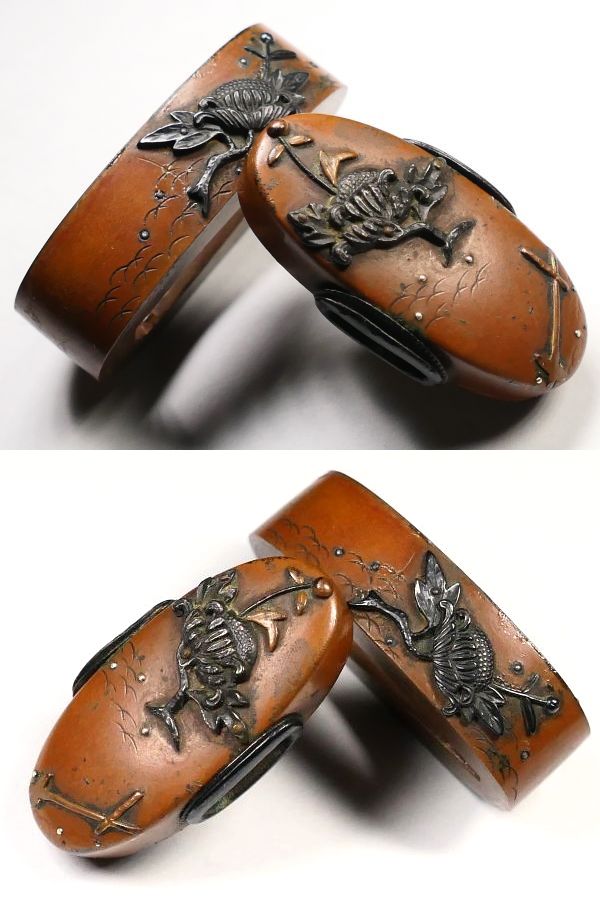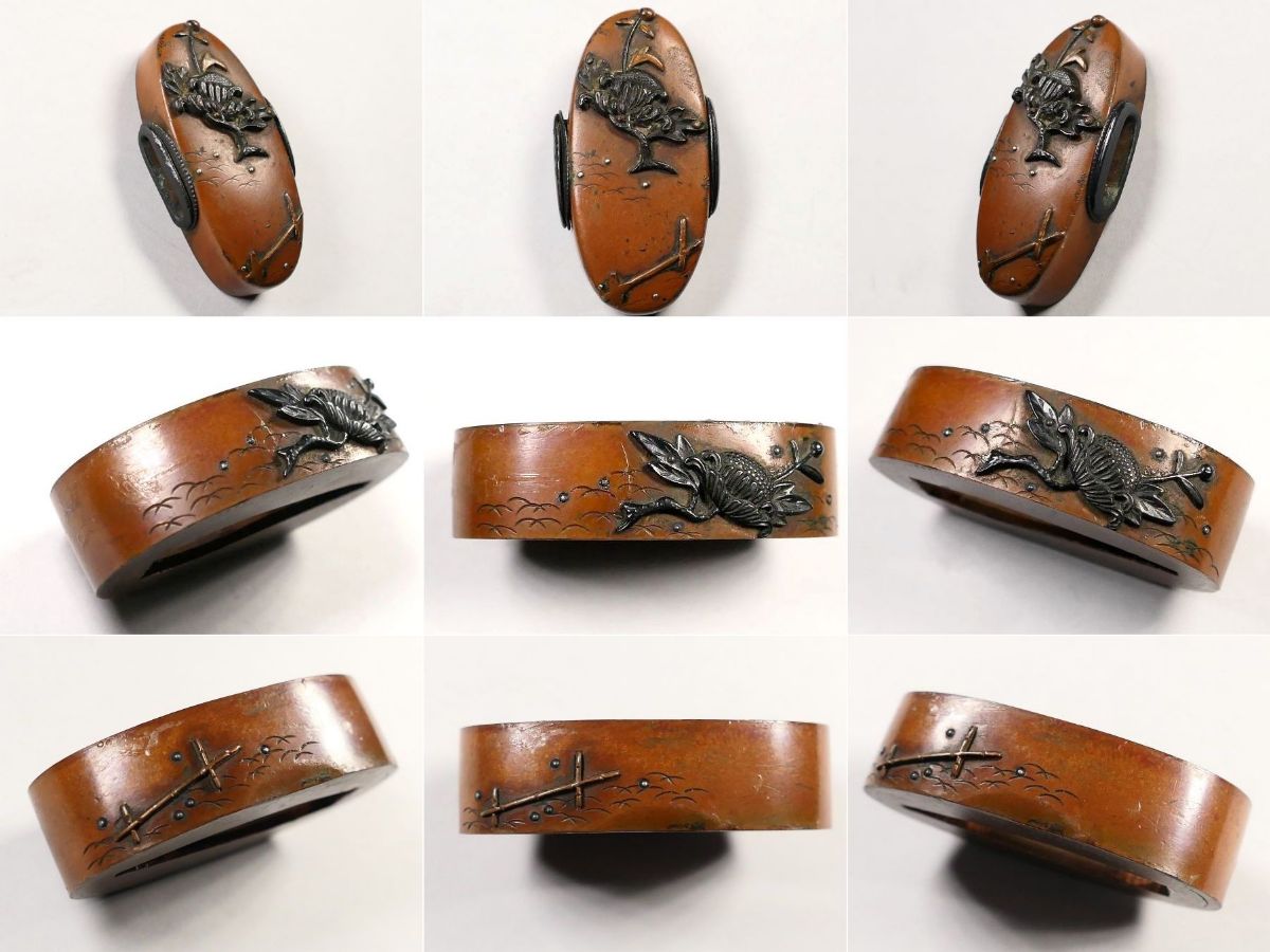| 商品説明 | 繊細な象嵌細工により 可憐に咲く牡丹の様子が表現された 趣の感じられる一品です。 作行から見て 奈良派の優品と推測しております。 詳しくは画像にてご確認下さい。 お好きな方、この機会に是非手に入れて下さい。 【繊細な細工】 【見栄え良き構図】 【趣の感じられる一品】 寸法: (縁) 約 3.80cm × 約 2.11cm × 約 1.07cm (厚み) (頭) 約 3.45cm × 約 1.64cm × 約 0.63cm (厚み) 時代: 江戸時代 材質: 素銅地 銘 : 無銘 状態:特に気になる大きな傷みはなく概ね良好。 画像にてご判断下さい。 :許容範囲内の時代傷みはご理解下さい。 |