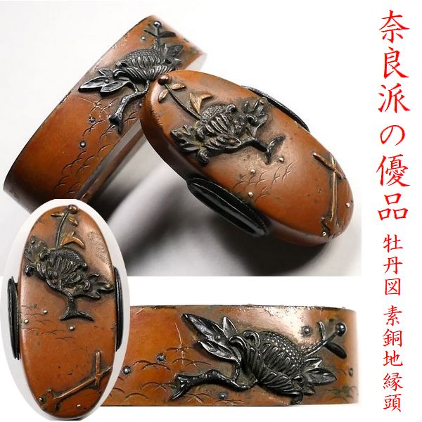 【刀装具 #4314 新入荷】 (縁頭) 奈良派の優品 繊細細工の牡丹図 銀象嵌 素銅地縁頭 鑑賞用にも拵え用にも幅広く活躍する一品 收藏