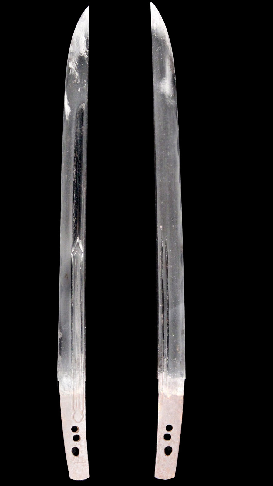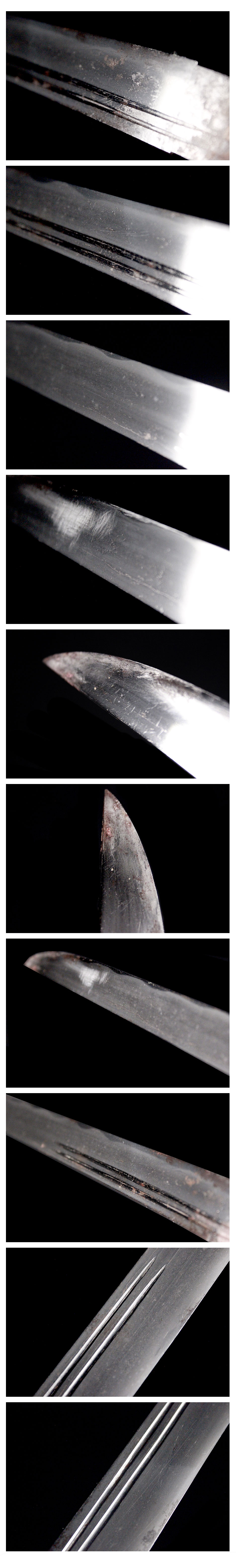 刀身長:約32cm 反り:約0.2cm 目くぎ穴:3個 元幅:約25mm 元重:約4mm 先幅:約18.2mm 先重:約3.1mm 刀身重:約176g 棟:庵棟 ハバキ:銅 |