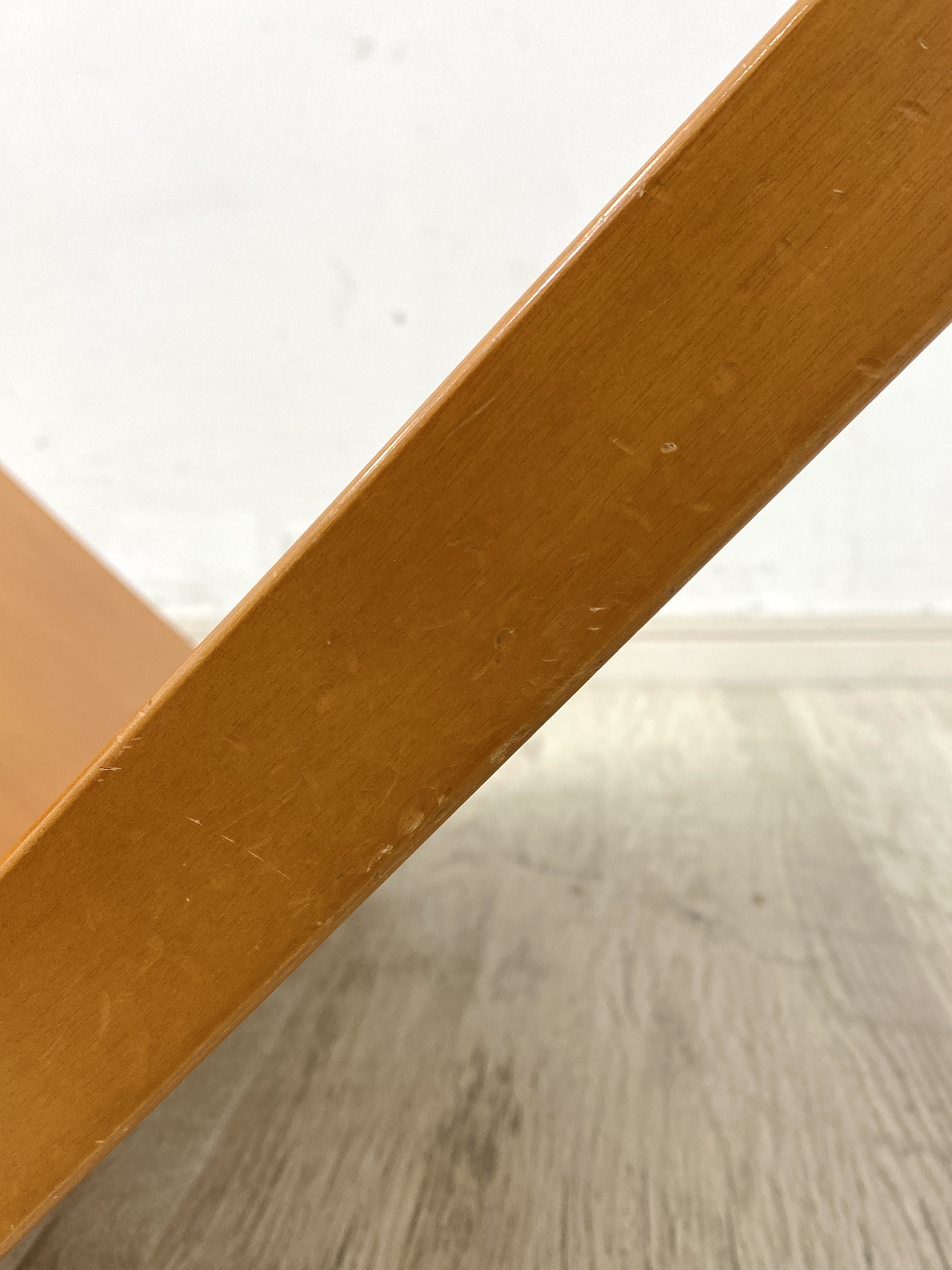 こちらはarflex MONTAGNA アルフレックス モンターニャです。 中古品です。 【arflex アルフレックス】 アルフレックスジャパンはイタリアのアルフレックス社で家具作りを学んだ保科正氏が、 日本での販売権とオリジナルデザインの製造権を持って帰国し、1969年に設立したモダンファニチャーブランドです。 以来、「イタリア生まれ日本育ち」のブランドとして日本のモダンインテリアシーンを牽引、 普遍的な価値に時代ごとの感性を取り入れながら、日本オリジナルの製品をつくり続けています。 アルフレックスより、MONTAGNAモンターニャ センターテーブルです。 メインデザイナーとして活躍した川崎文男氏のデザインによる家具です。 山脈をモチーフにした特徴的な木製脚に、ガラス天板が乗っている直線的で大胆なシルエットが特徴。 イタリア語で「山」を意味する名の通り、躍動的な木製ベースが空間のアクセントにぴったりです。 天板は片面がタペストリーガラス(フロストガラス)になっています。 タペストリーガラスとは、透明ガラスの表面にサンドブラスト処理を施した後、 化学処理(フッ酸処理)で表面を滑らかに仕上げた半透明のガラスです。表面の肌触りが非常に滑らかで、 上品で柔らかな光を拡散する特徴があります。画像では無加工の面を上面にしています。 脚部は廃番となったチェリー材だと思われ、ほんのり赤みのあるナチュラルカラーが魅力です。 モダンな魅力が詰まったスタイリッシュな一台です。お部屋のアクセントにいかがでしょうか。 【コンディションについて】 天板は使用に伴う薄い擦りキズ、縁は両面1箇所ずつ小さく欠けていますが、全体の印象としては良好です。 脚部は所々キズがありますが天板設置後は目立たないと思います。 イタリアモダンの佇まいを感じさせる、存在感抜群のテーブルとなっています。 他詳細については下記画像も併せてご参照ください。