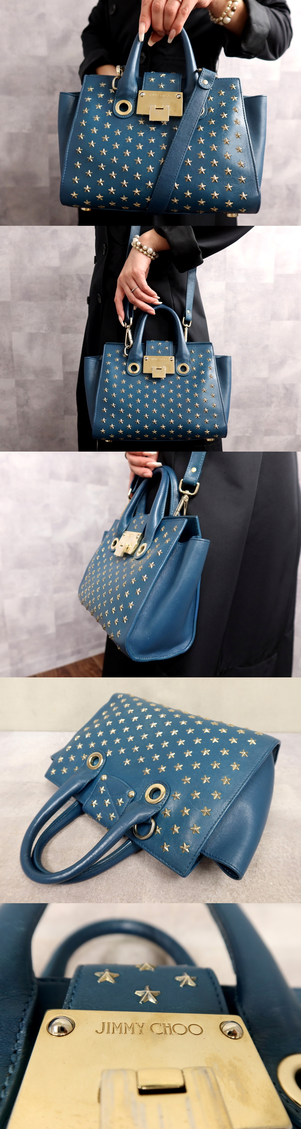 ●美品●JIMMY CHOO ジミーチュウ●ライリー●スタースタッズ●カーフ レザー 本革●2way ハンド バッグ●セルリアンブルー●収納●Js65692 收藏