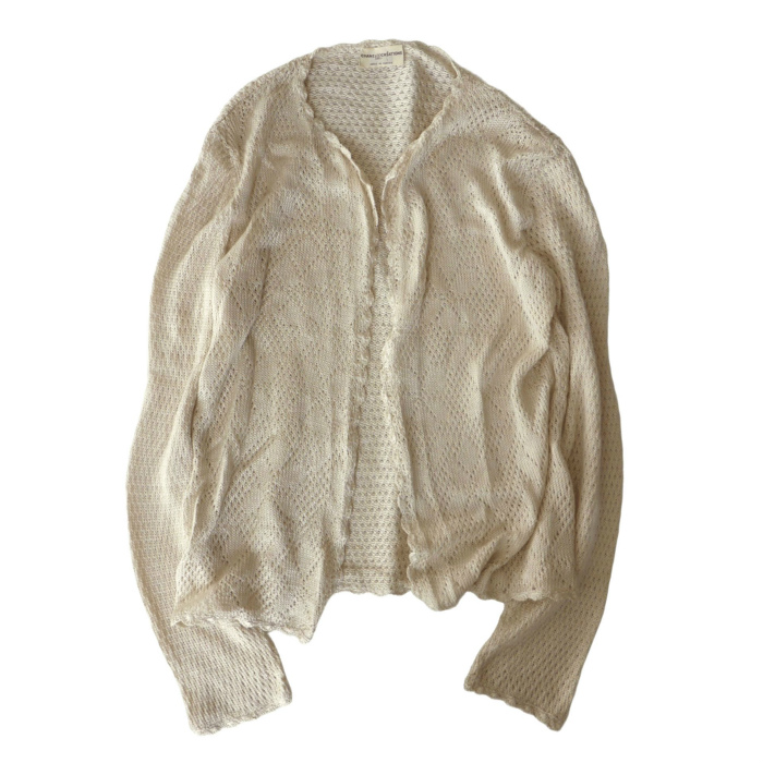 | ヴィンテージシャネルのローゲージニットカーディガン。 ボタンなしのシンプルな羽織タイプ。 透かし編みの模様が淡白過ぎない仕上がりです。 滑らかで上品な光沢のある生地は素肌にも馴染みやすく、春夏に重宝する一着。 やわらかいお色味と癖のないシルエットはボトムを選ばず、様々なスタイルにマッチします。 シンプルなデザインだからこそ素材やシルエットのこだわりを感じる一着です。 |