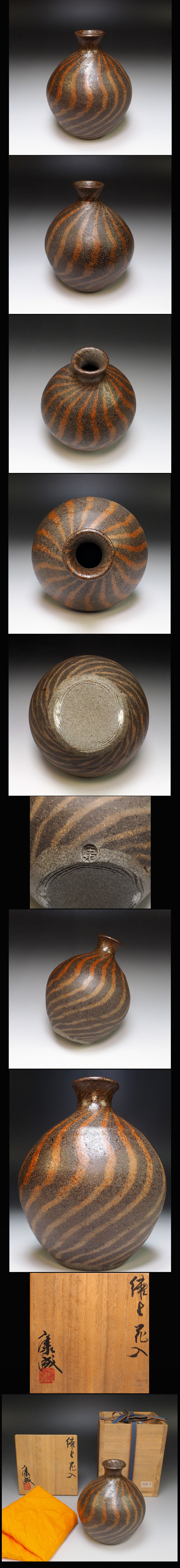 ![]() 練上手の人間国宝、松井康成の徳利型の「練上花入」です。 作品に印銘サインがあります。 サイズ:約 径 10cm 高 12.1cm 共箱・布付 作品状態:外傷キズはなく美品です。(目視確認です。) こちらの作品は真作保証の安心頂ける作品であることをお約束いたします。 不明な点は、入札前に質問等でご確認下さい。 松井康成 昭和2年(1927)~平成15年(2003) 重要無形文化財「練上手」保持者(平成5年認定) 長野県に生まれる。明治大学文学部を卒業後、笠間市の古刹月崇寺の住職を継ぎ、昭和35年境内に築窯し、広く中国古陶磁の技法を研究した後、練上に絞った作陶活動を展開させていった。練上は、色や濃淡の異なる土を組み合わせていくことによって様々な文様を表す技法であるが、性質の異なる二種類以上の陶土を用いるため、土の収縮率の違いなどから乾燥や焼成の段階で割れることも多く、高度な技術を要する。松井は、練上で用いる色土の収縮率を同じにするための研究を重ね、練上技法を様々に応用して次々と独自の手法を発表し、陶芸界に新生面を切り拓いた。 | |||
