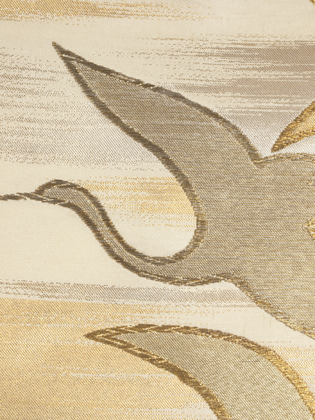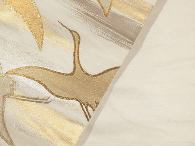 象牙(ぞうげ)色の地に霞(かすみ)と飛鶴(ひかく)の文様が織り込まれている、西陣織の袋帯です。 霞がたなびく黎明(しののめ)の空に舞い飛ぶ鶴たちが優雅にあらわされています。金糸、銀糸、銅色の箔糸が品の良い豪奢さを醸しています。 ユーズド品で、前の折り跡と結びジワがあるほか、画像のとおり、前の中央に直径約 1mm の黄変が 1 か所とその右付近に直径約 2mm-2cm のうすよごれが 2、3 か所あります。また、胴回りの柄抜き部分に直径約 5mm のうっすらとした黄変やうすよごれが数か所あります。ごくこまかなうすよごれなどは若干ありますが、そのほかに目につく大きなしみやよごれ、褪色などのダメージはなく、関西巻き(逆巻き)であればダメージは出ないので、気にされない方であればご着用は可能と思われますが、状態ランク=「D」のご着用対象外、リメイク素材用とさせていただきます。帯芯は入れられていないお仕立てになっています。 |