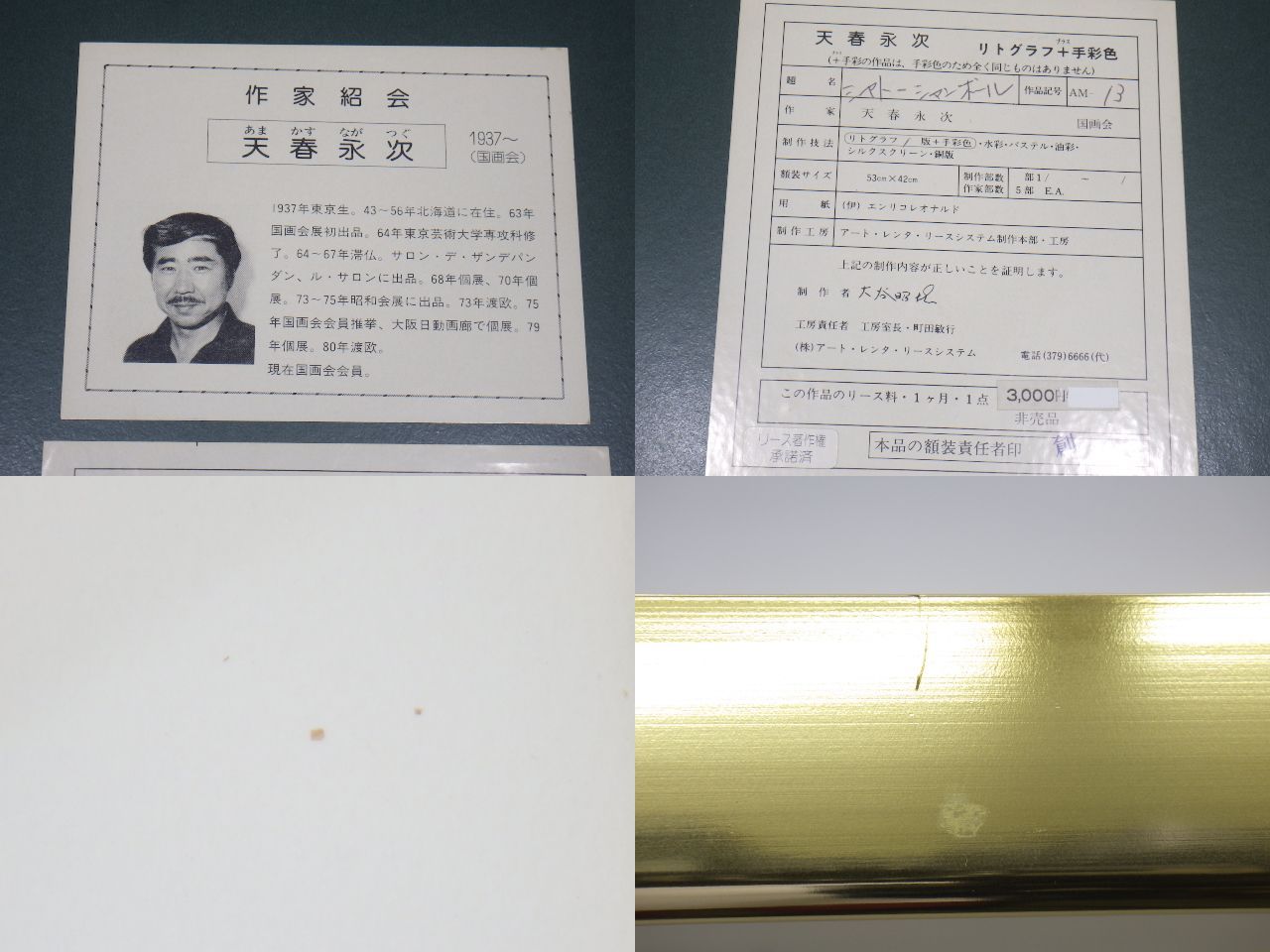 ※下記、【商品詳細】及び【落札後のご案内・注意事項・備考】欄をお読みいただき、ご理解頂いた上でご入札頂けますようお願い致します。 ![]() ![]() ![]() ![]() 《商品詳細 》 ◆国画会 天春永次 シャトー ウ゛ィランドリー・ロアール/シャトー シャンボール リトグラフ+手彩色 直筆サイン 2点セットを出品致します。 ◆シャトー ヴィランドリー・ロアール 65/100 ◆シャトー シャンボール 5/100 ◆画寸(マット窓) 横:約39.5cm 縦:約29cm *素人採寸の為、多少の誤差はご容赦下さい。 ◆額寸 横:約51.3cm 縦:約40cm 厚み:約2.2cm ◆箱入り 《商品状態 》 ◆中古品となります。 ◆作品/状態良好です。 ◆マット/わずかな汚れがございます。 ◆額/擦れや小傷がございます。 [ ※商品についての注意事項 ] ◆ いずれも画像を良くご確認頂き、ご自身の判断で納得されたうえで入札をお願い致します。 ◆ 画像につきましてはデジカメ撮影の為、実際の色合いと異なる事もありますのでご了承ください。 |