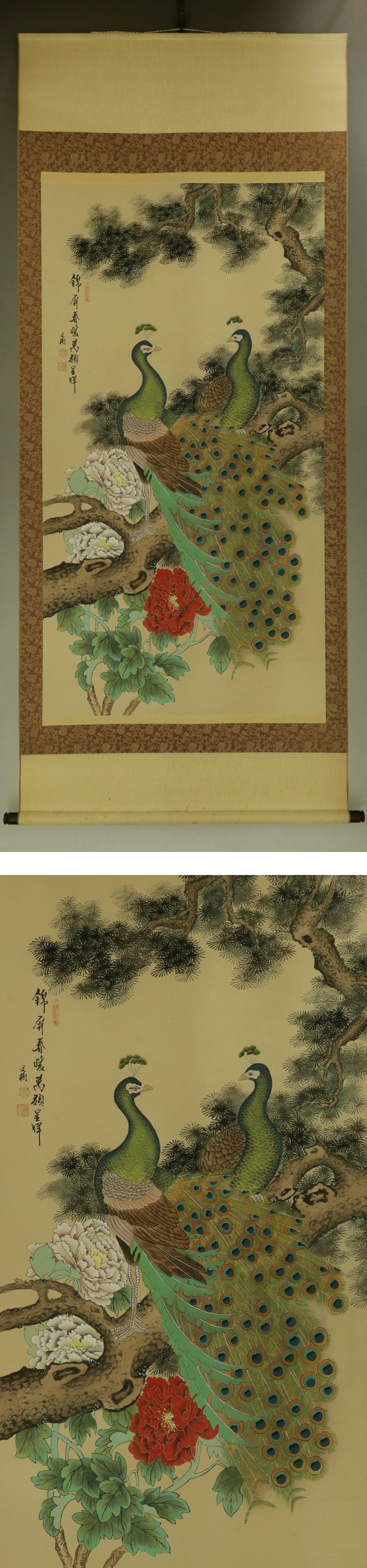 在銘【孔雀図】 本紙は、軽い染み、軽い汚れがあります。 表装は、染み、汚れがあります。 【サイズ】 作品 横約68.5cm×縦約129cm 表装 横約79.5cm×縦約191cm |