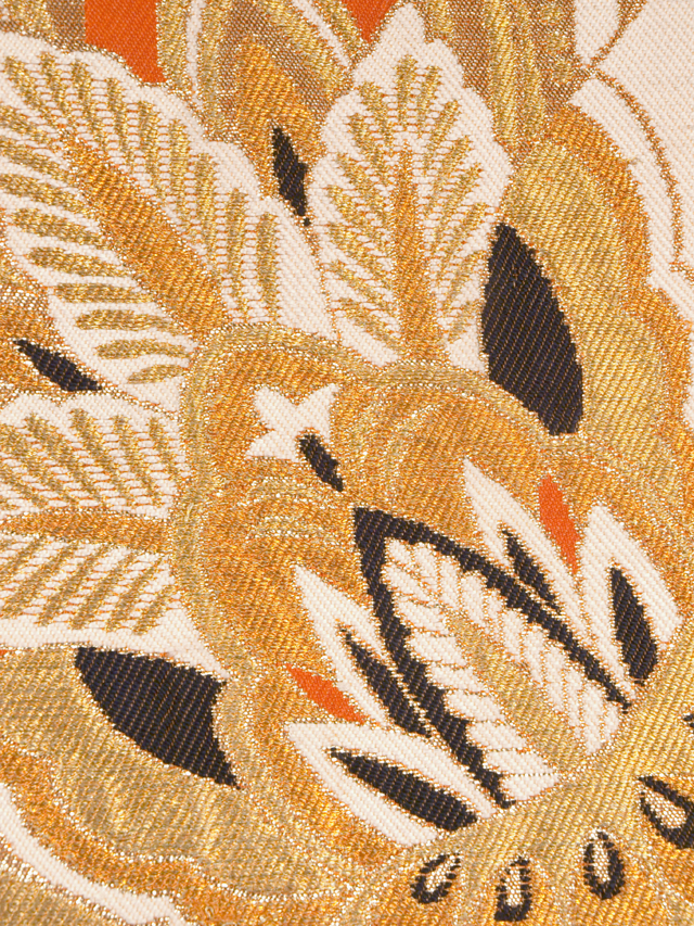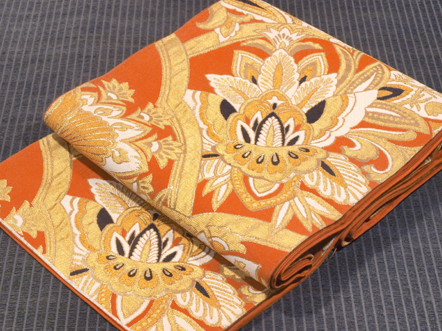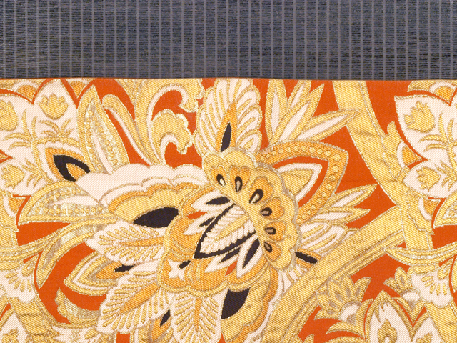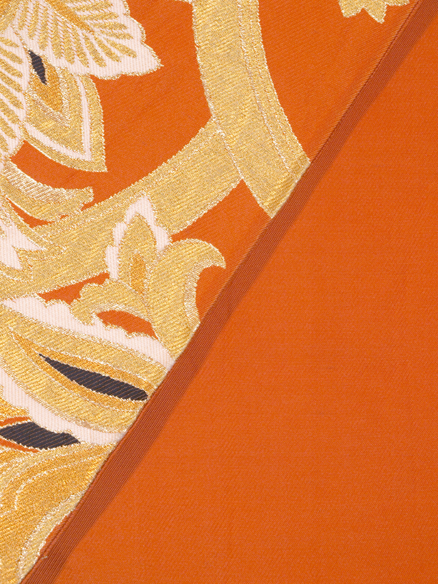 全体的な印象としてはやや沈んだ蜜柑(みかん)色の地に、更紗調の唐花草の文様が織り込まれている、西陣織の袋帯です。 昭和初期ごろにつくられたと思われるアンティークのお品です。大胆でオリエンタルな趣がきらびやかです。帯芯は入れられておらず、帯端の折り返し内側の綴じもありませんが、このままお使いいただけます。 結びジワと前の折り跡があるほか、胴回りの柄抜き部分や裏地に直径約 2-5mm のこまかなうすよごれがちらほらとあります。そのほかに目につく大きなしみやよごれ、褪色などのダメージはなく、表地は良好な状態で、ご着用時に支障はないので、気にされない方であればご着用は可能です。 |