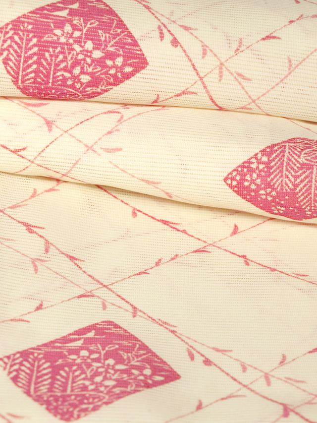 淡い淡黄(たんこう)色の地に、柳でかたどられた襷(たすき)と松や小花などの草花が配された色紙の文様が染められている、三本絽の洗える着物の小紋です。単衣仕立てです。夏着物です。 かわいらしさのあるお色目で、柳の襷も小粋な印象です。強い透け感があります。洗える着物は 1 シーズンに 1 枚は持っておくと重宝します。お仕事でお着物をお召しになる方なら、なおさらですね。 しつけ付きの仕立て上がり未使用保管品で、しみやよごれ、褪色などのダメージもありません。新品同様です。 |