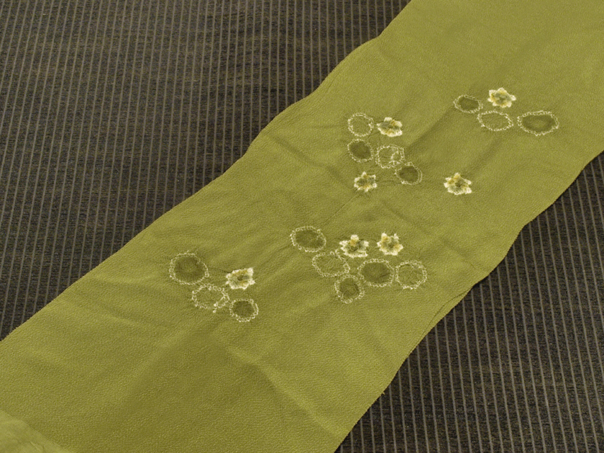 やや淡い草色の地に、絞り染めで丸と花の文様が施されている、縮緬の帯揚げです。 シンプルですが落ち着きのあるかわいらしさが感じられます。大きめのシボの縮緬地です。 ユーズド品と思われますが、使用感はあまり感じられません。目につくしみやよごれなどのダメージもなく、きれいな状態です。 |