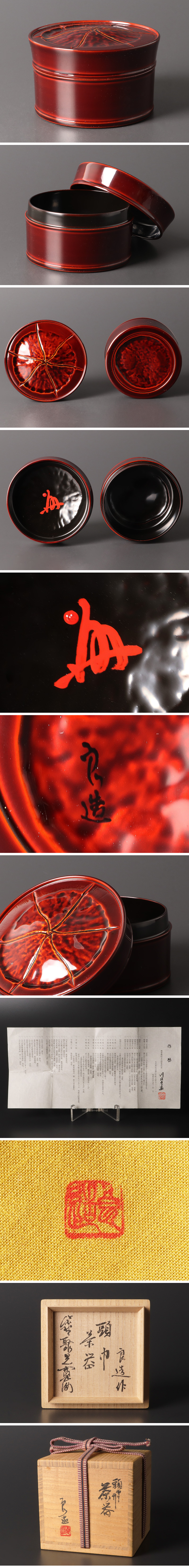 【川北良造】 山中漆器の職人であった父、川北浩一の指導の下、木材を轆轤により形成させていく「木工挽物」の技法を修行、さらにその後、後の人間国宝となる氷見晃堂に師事して日本伝統工芸展に出品を重ね、1966年、67年に連続して日本工芸会会長賞を受賞、76年より理事に就任。また、地元においても93年に山中漆器ろくろ技術保存会会長に就任して地域の活性化にも貢献を示している。伝統の技法を深く研究し、欅、桑、楓、黒柿などの特性を生かし、また、象嵌や青貝、珊瑚、べっ甲などを用いて現代的な装飾を施した香合・棗・鉢といった小品作から棚物まで幅広い製作を続けており、94年に木工芸で国指定重要無形文化財(人間国宝)の認定を受けている。 【小野澤寛海】 昭和9年(1934)、静岡県生まれ。臨済僧。昭和26年(1951)、廣徳寺の福富以清に就いて得度。その後、妙心僧堂に掛塔。昭和40年(1965)、大徳寺塔頭聚光院住職に就任。昭和61年(1986)、本山内局庶務部長。平成7年(1995)、宗務総長に就任。千利休四百年遠諱法要を聚光院住職として務める。聚光院伊東別院に住す。 |