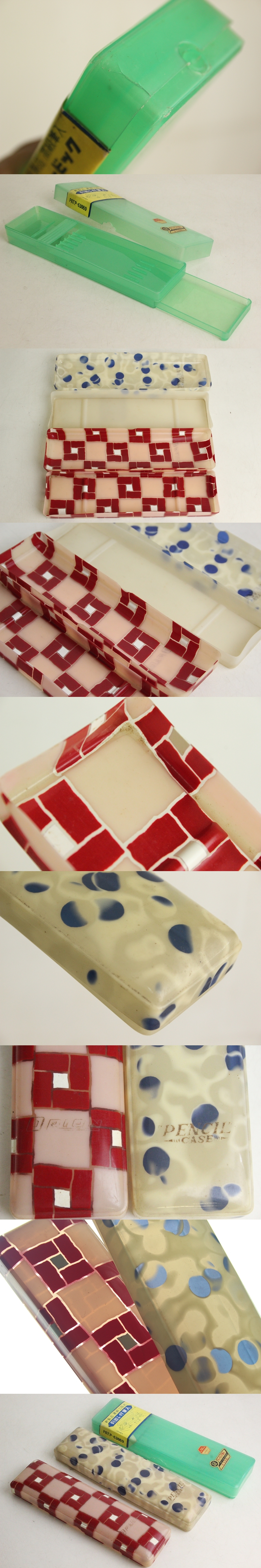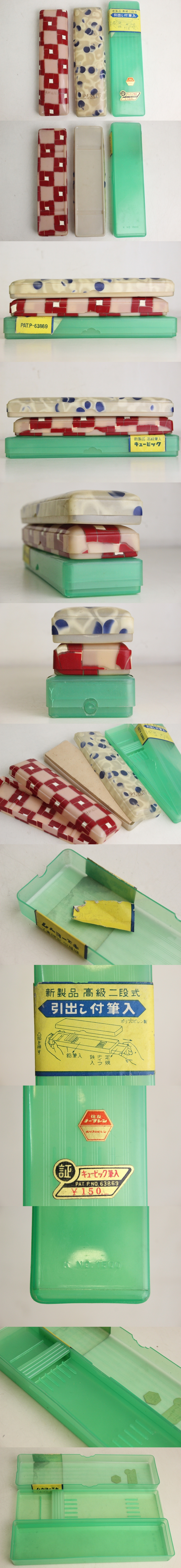 TB526未使用 セルロイド 樹脂 筆箱 3個◇昭和レトロ/当時物/緑割有/高級二段式/文具/ペンケース/筆入/赤/格子/白/水玉/古道具タグボート 收藏