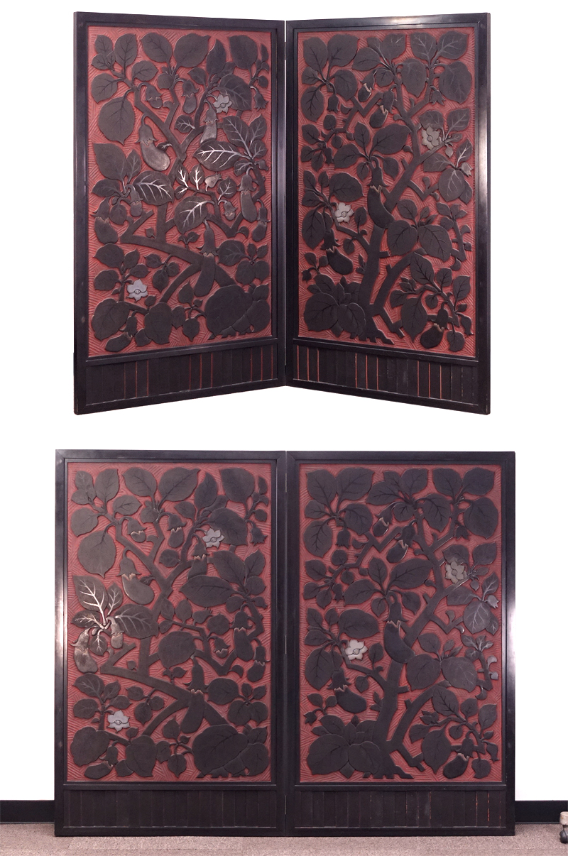 村上木彫堆朱茄子図屏風です。