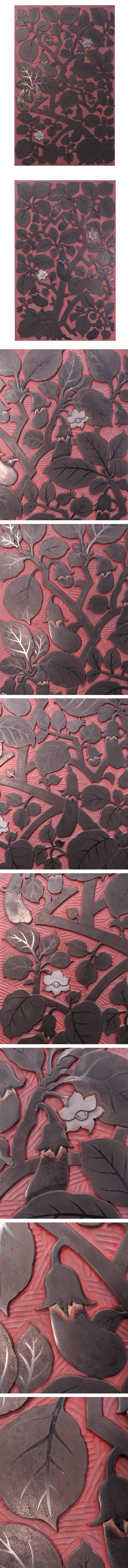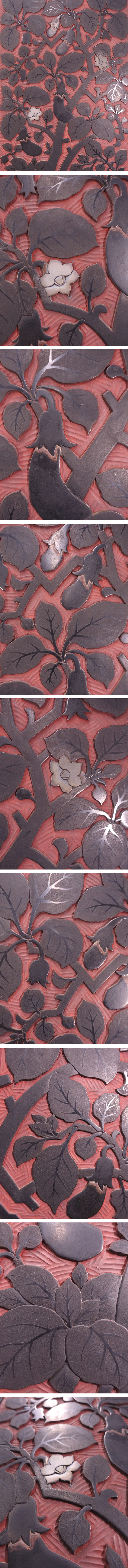 ∇花∇村上堆朱の名工【初代小野為郎】作 村上木彫堆朱茄子図屏風 漆刻画衝立 作者彫銘 希少な大作 本物保証 收藏