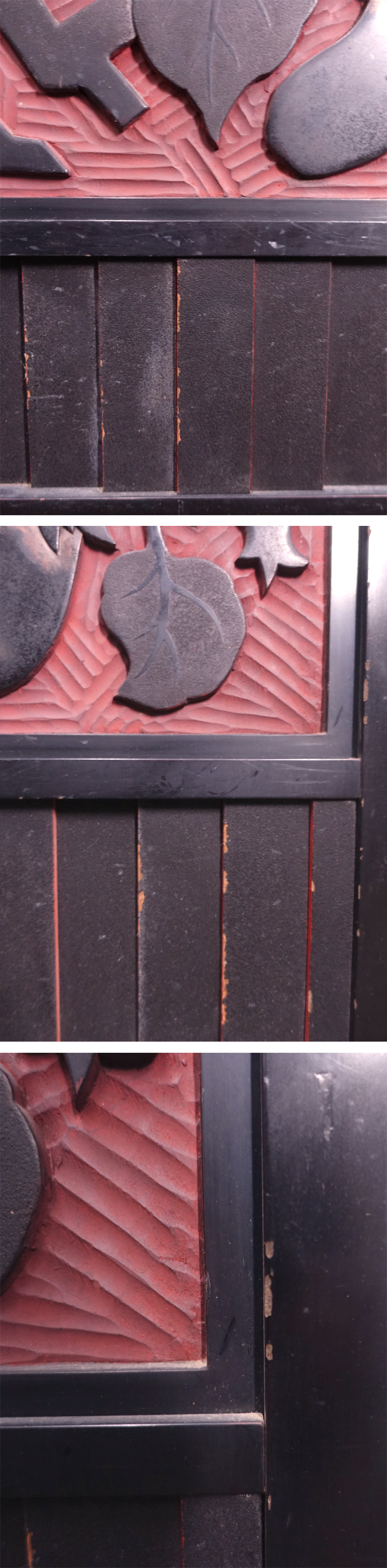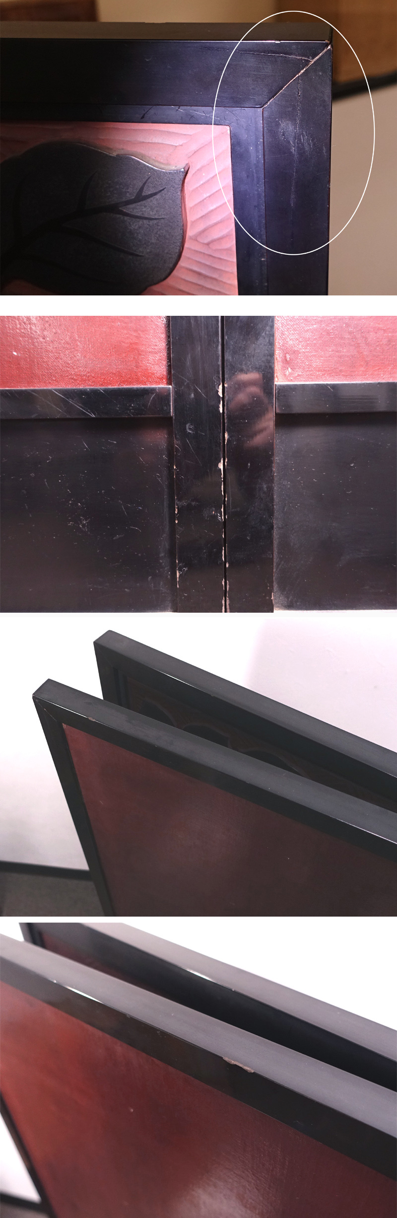 【状態】    スレ汚れや一部漆の剥落や薄いクラック、随所のアタリ疵など小傷等の経年感が相応に見られますが、鑑賞上は目立つ大きな傷みはなく良好な状態です。※上部の枠ですが、右側がやや緩くなっています。作品の作り方故に当然ですが、ここだけを持ち上げますと外れてしまう可能性がございますので、お取り扱いにはご注意下さい。