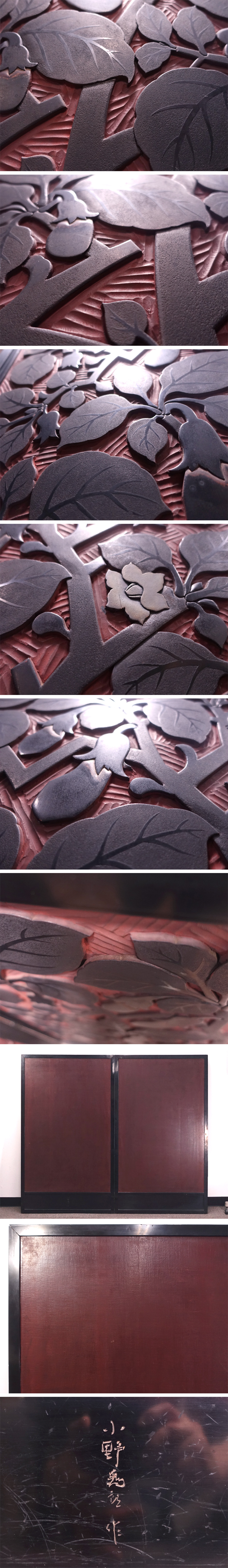 ∇花∇村上堆朱の名工【初代小野為郎】作 村上木彫堆朱茄子図屏風 漆刻画衝立 作者彫銘 希少な大作 本物保証