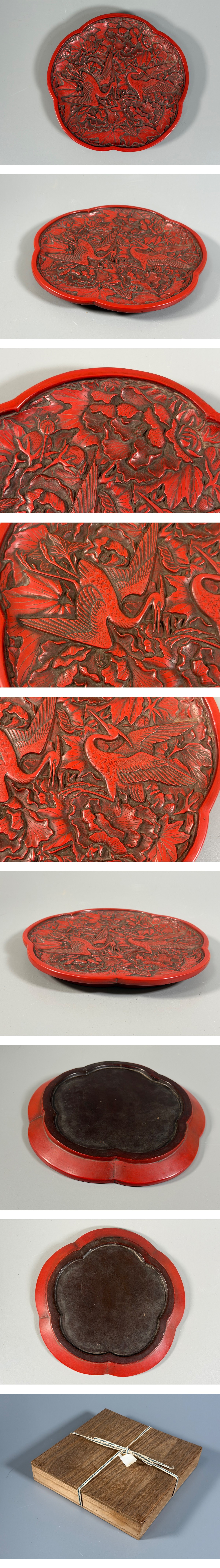 【小】5596 中国古美術 細工見事な時代唐物木地堆朱花鳥文皿 梅形盆 古玩 保管箱有 茶道具 椎朱 煎茶 超絶技巧 彫刻 細密細工 收藏