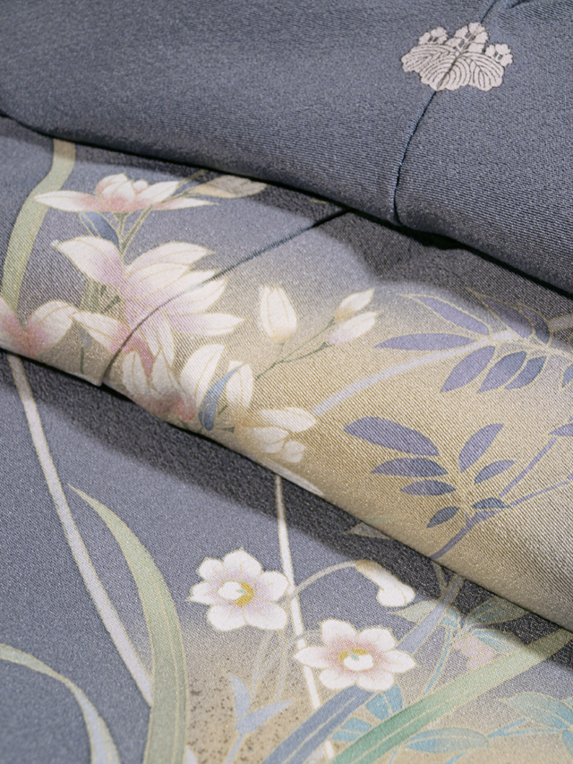 | 詳細 | 深く沈んだ藤鼠(ふじねず)色の地に花の文様が友禅染めされた縮緬の訪問着です。袷仕立てです。染め抜きで「五三桐」の一つ紋が付いています。「春水」という作家さんの落款が右衽に入っています。 とても品の良い洗練されたお色目で、幅の広いご年代でお召しになれます。凛とした雰囲気とはかなげな風情が感じられる現代的な意匠で、落ち着いた艶やかさがあります。シボがとてもこまかく、サラリとした上質の縮緬地です。 しつけ付きの仕立て上がり未使用保管品です。しみやよごれ、褪色などのダメージもなく、新品同様です。 |
