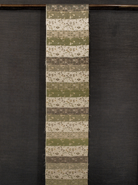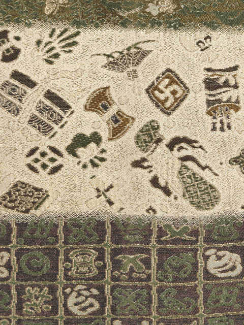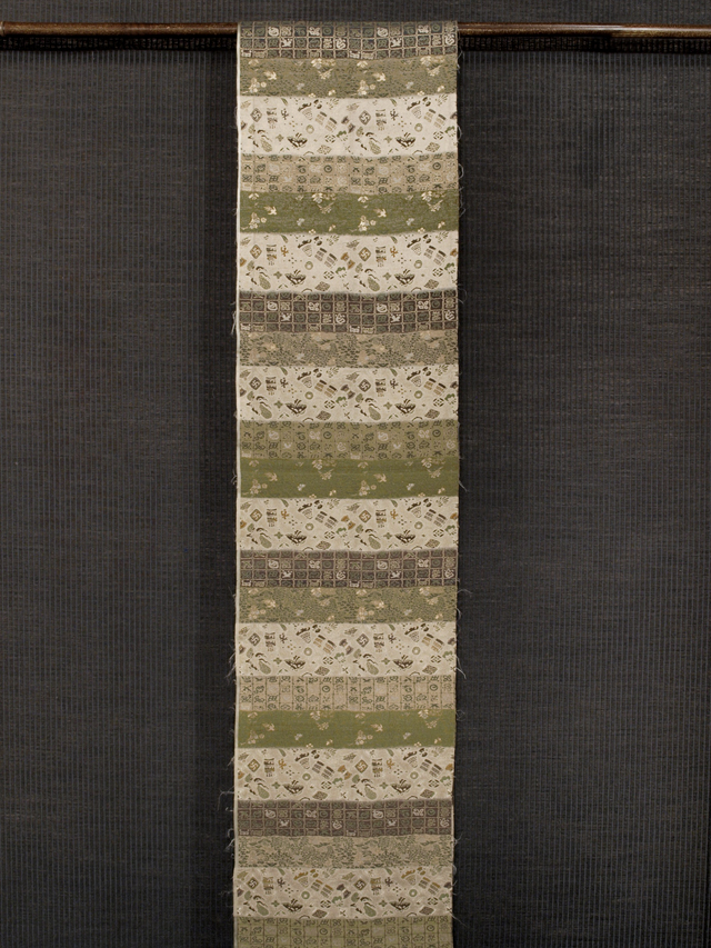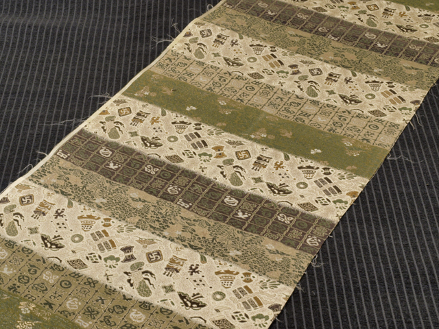 | 詳細 | 練(ねり)色の地に宝尽くしの文様が織り込まれたよこ縞、鳥と蝶、草花の文様が織り込まれたよこ縞の文様が織り込まれている西陣織の丸帯のはぎれです。 昭和初期ごろにつくられたと思われるアンティークのお品です。緑色を基調としたお色と縁起の良い文様が格調がありながらもかわいらしさが感じられる意匠です。 丸帯の解きですが、半分に裁断されていて片面だけしかありません。また、両端の縫い山にスレ感と織りの傷みがちらほらとあるほか、たれ上のかいきり線の中央に直径約 1cm の織りのゆるみがあります。こまかなくすみやうすよごれなどはあるかもしれませんが、そのほかに目につく大きなしみやよごれ、褪色などのダメージ見当たらず、この時代のものとしては全体的にとてもきれいな状態です。 解き洗い済みです。 |