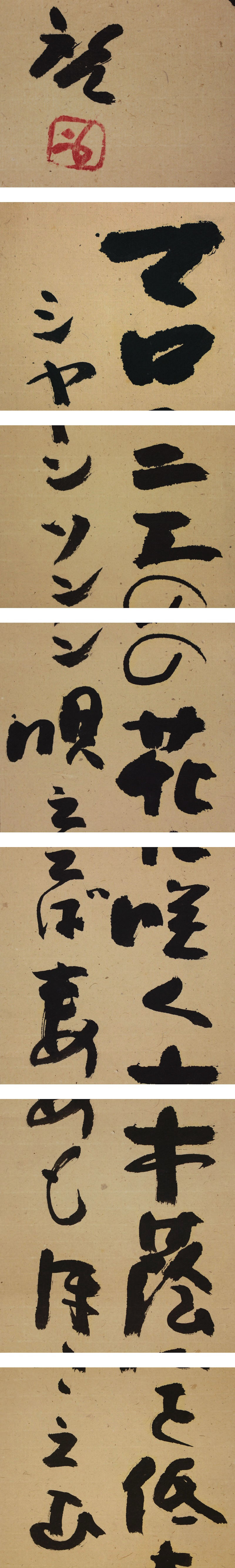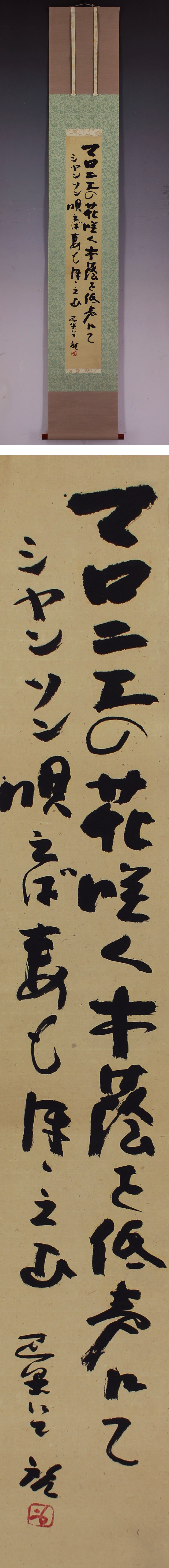 藤原啓 ふじわら-けい(1899-1983) 昭和時代の陶芸家。 明治32年2月28日生まれ。文学の道をこころざしたが,昭和12年郷里の岡山県にかえる。三村梅景,金重陶陽(かねしげ-とうよう)の指導で作陶生活にはいる。備前焼の再興につくし,45年人間国宝となる。端正で豪放な作風で知られた。長男雄(ゆう)も人間国宝。昭和58年11月12日死去。84歳。早大中退。本名は啓二。 本紙は、ごく軽い染みがあります。 表装は、軽い皺があります。 【サイズ】 作品 横約15cm×縦約97.5cm 表装 横約29.5cm×縦約181cm |