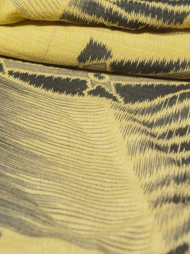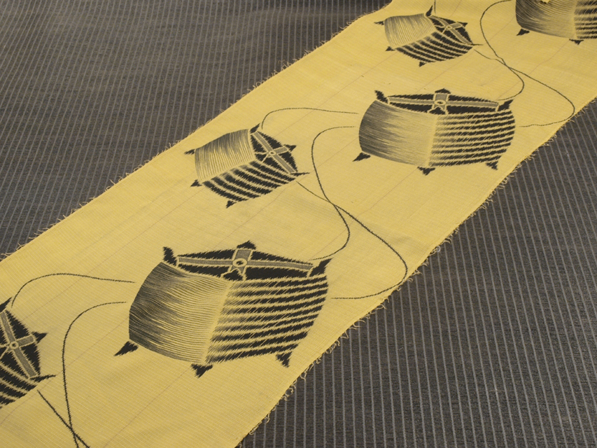 やや沈んだ桑染色の地に、よこ縞の地紋が織り出され、糸巻きの文様が染められている、変わり縮緬のはぎれです。 大正から昭和初期ごろにつくられたと思われるアンティークのお品です。ころっとしたフォルムの糸巻きが愛らしいです。やわらかな縮緬地です。 全体的にアンティークなりのうっすらとしたくすみがあるほか、画像のとおり、うっすらとしたこまかな黄変や色うつり、うすよごれがところどころにあるほか、中央付近に直径約 1cmm-1cm の小穴が数か所ほど、下端から約 31cm の左耳寄りに直径約 2mm の小穴が 2 か所、上端から約 15cm の右耳寄りに直径約 5mm の小穴が 1 か所あります。そのほかに目につく大きなしみやよごれ、褪色などのダメージはなく、この時代のものとしてはきれいな状態です。生地の力もあります。※風楽の出品内で同じ柄のものを複数出点している場合もあります。風楽で洗い張り済みですので、気持ちよくお使いいただけます。 |