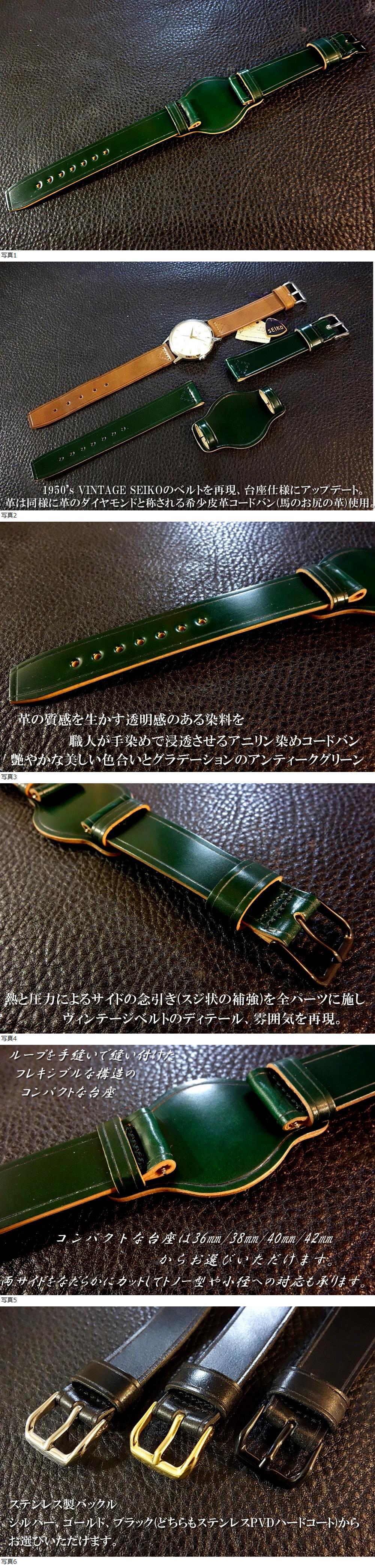 ◆台座付VINTAGE BELT◆高品質国産コードバン カスタムオーダー(台座サイズ/バックルカラー) 20mm ANTIQUE GREEN 受注生産 腕時計ベルト 收藏