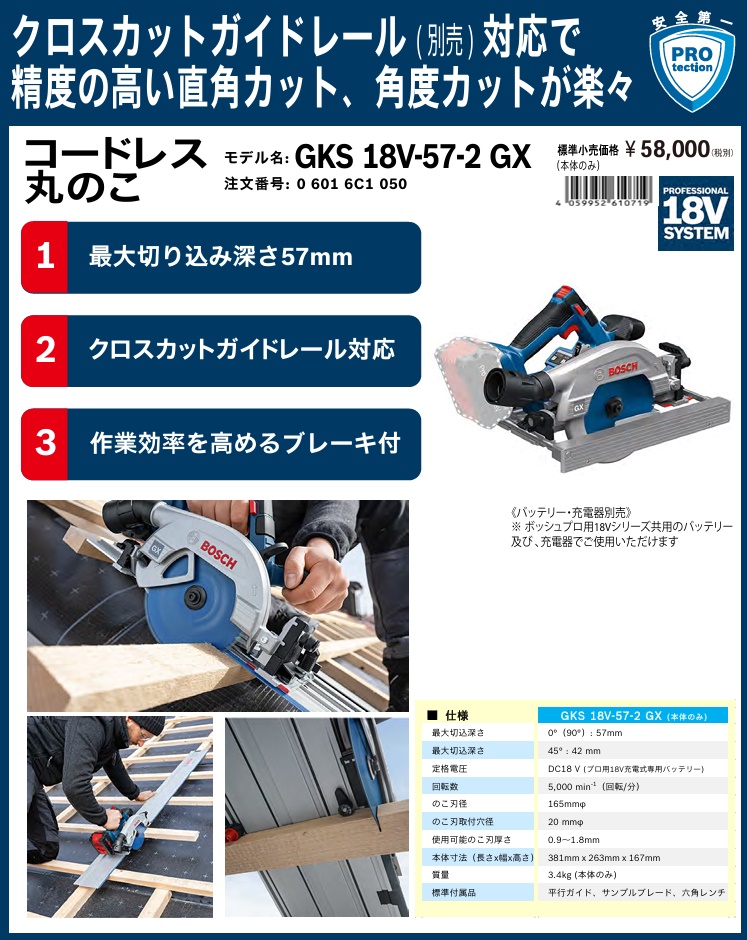BOSCH ボッシュコードレス丸ノコGKS18V-57-2GX本体のみです。※バッテリー・充電器は別販売品です。クロスカットガイドレール(別売)対応で精度の高い直角カット、角度カットが楽々■特長・最大切り込み深さ57mm・クロスカットガイドレール対応・作業効率を高めるブレーキ付■仕様・最大切込深さ:0°(90°):57mm・最大切込深さ:45°:41mm・定格電圧:DC18V(プロ用18V充電式専用バッテリー)・回転数:5,000min-1(回転/分)・のこ刃径:165mmφ・のこ刃取付穴径:20mmφ・使用可能のこ刃厚さ:0.9~1.8mm・本体寸法:長さ381mmx幅263mmx高さ167mm・質量:3.4kg(本体のみ)・標準付属品:平行ガイド、サンプルブレード、六角レンチ