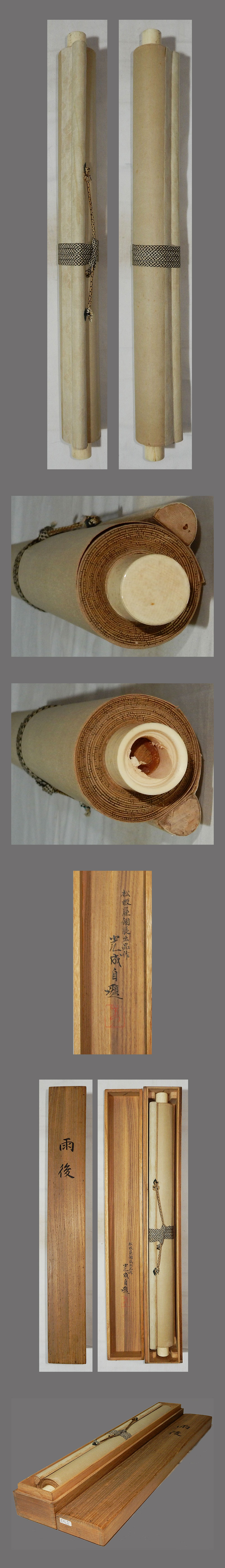 ・掛軸の軸先ですが、細心の注意を払って梱包しておりますが、 配送中の振動・気温・経年劣化等で外れてしまうことがあります。 軸先の外れは、破損ではございませんので、返品の対象にはなりません。 大変お手数ですが、お客様ご自身での修復をお願い致します。 ・添付写真の画像と説明文でご理解頂ける方、ご入札を宜しくお願い致します。 ・添付写真の画像は撮影の光度により、現物と若干の色合いの相違が生じる事があります。 ・添付写真の画像は受取完了のご連絡を頂いた後に速やかに消去しますのでご了承下さい。 ・土・日・祝日はお休みさせて頂きますので、商品発送は、月曜日以降になります。 ・祝日の場合は、翌日の平日以降の発送になります。 ・土・日・祝日は、メールの返信が若干遅れる事がございます。どうか、ご了承下さい。 ・時間的に余裕がない場合などでお答えが出来ない事も多々有ります。 ご不明な点は落札日前日までに早めにご質問下さい。 ・商品トラブルがあった場合は、直ちにご連絡下さい。 お取引に付きましては迅速・丁寧に対応させて頂きます。 ・落札後、できるだけ2日以内に連絡(返信)を頂ける方、 5日以内にご入金できる方の御入札を御願い致します。 ・新規の方や評価の総評が悪い方は当方の判断にて、入札取り消しを行う場合がございます。 ・お取引に付きましては、迅速、丁寧に対応致しますのでどうぞ、宜しくお願い致します。 ・古美術品や古物や古書画の出品が多いため、神経質な方がご入札される場合は、 ご自身が納得の行く価格でご入札ください。 ・万一、ヤフーのシステム障害により、公正なオークションができなかったまま終了し、 落札者様にご落札された場合は、当方より取引ナビで取引中止のご連絡を致します。 その時は、どうか、ご了承をお願い致します。 ・終了当日・直前の入札の取り消しは、 トラブルの原因となりますのでご遠慮お願い致します。 ・入札後の取り消し(キャンセル)は行っておりません。 ・落札後のキャンセル・返品はお断りしてます。 入札前によくご確認頂き、間違いのないようにご注意下さい。 |