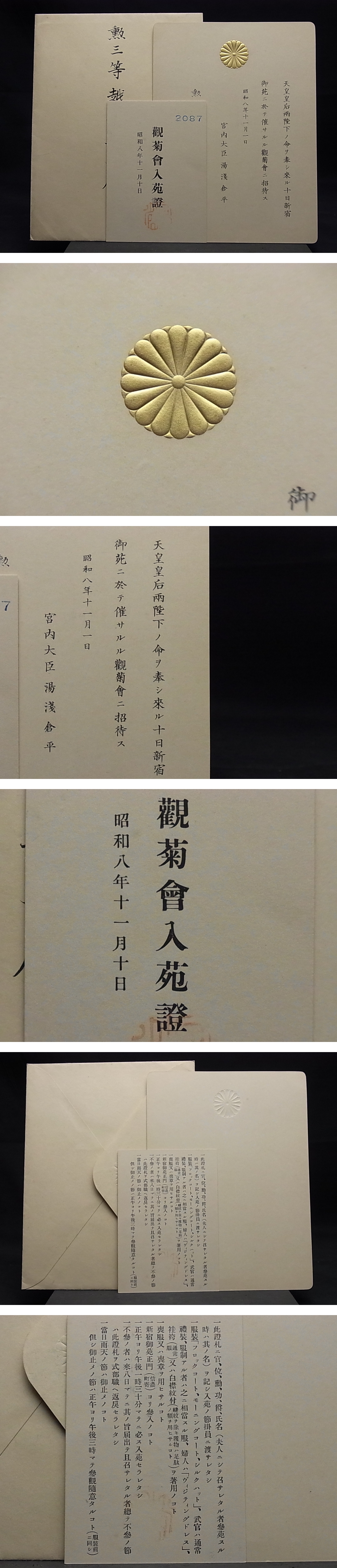 | d966 昭和8年 旧日本軍 勲三等 宛 天皇皇后両猊下 命 観菊会 招待状 観菊会入苑證 湯浅倉平 | |
