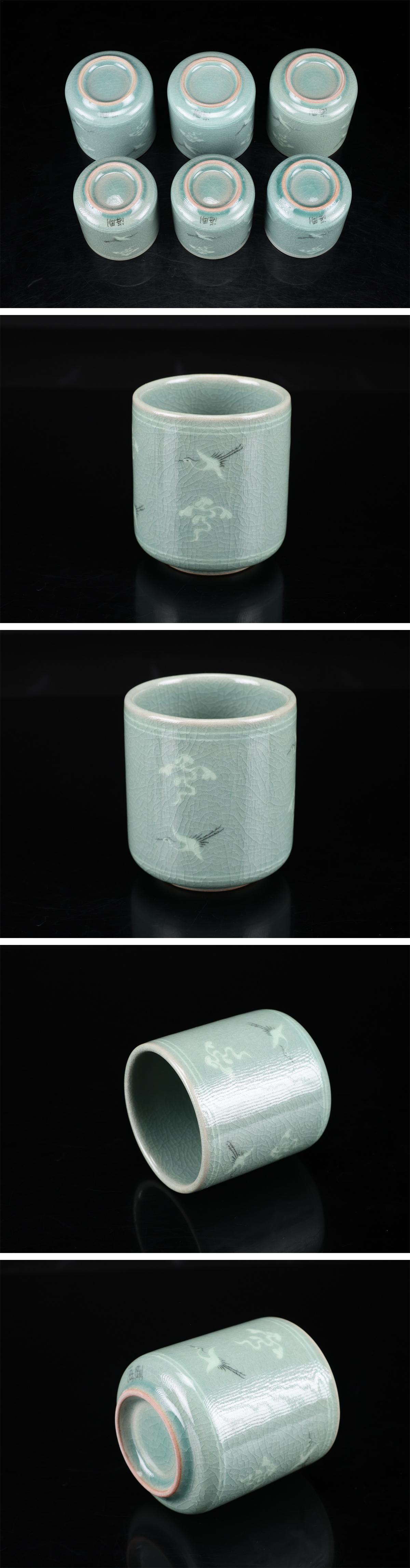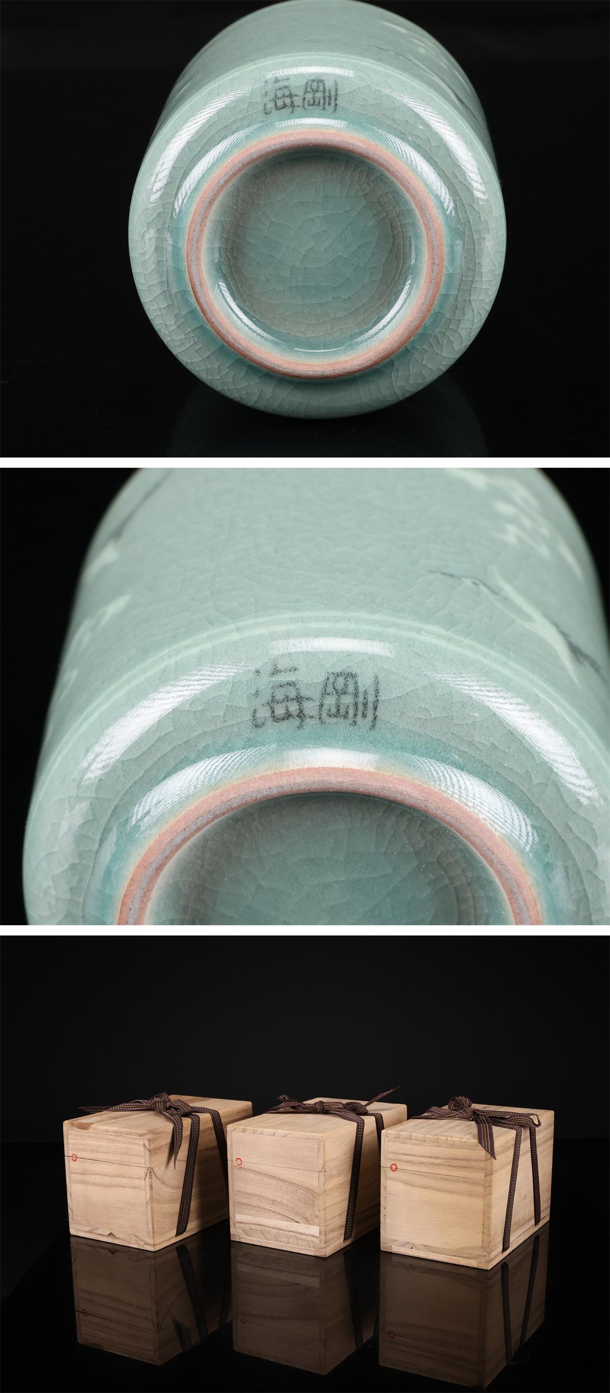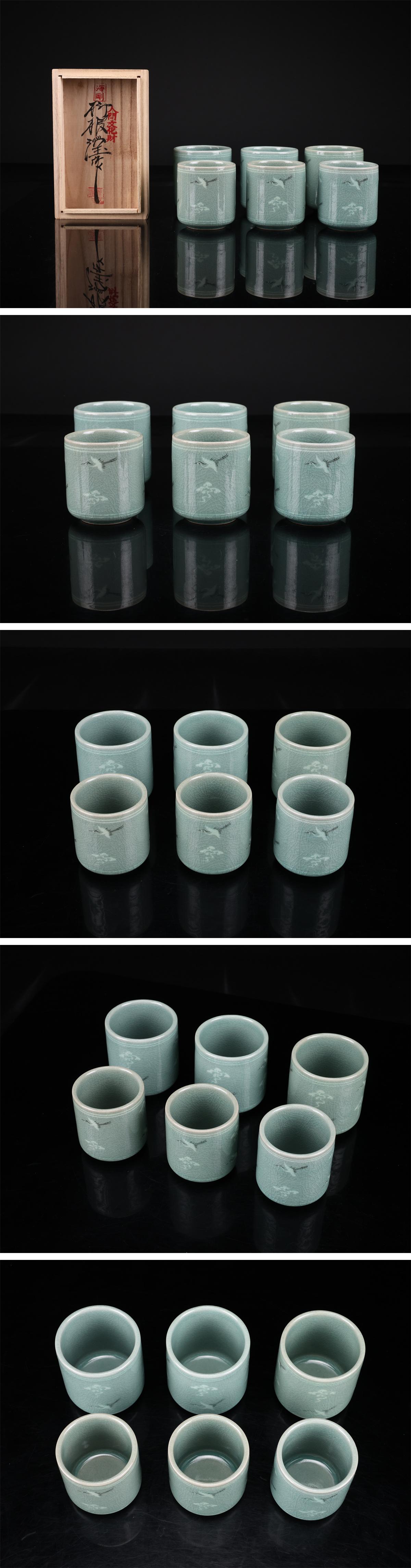 【吉】CP386 韓国人間国宝 【柳海剛】 青磁 象嵌 湯呑 3組 6点セット/共箱付 未使用品! 收藏