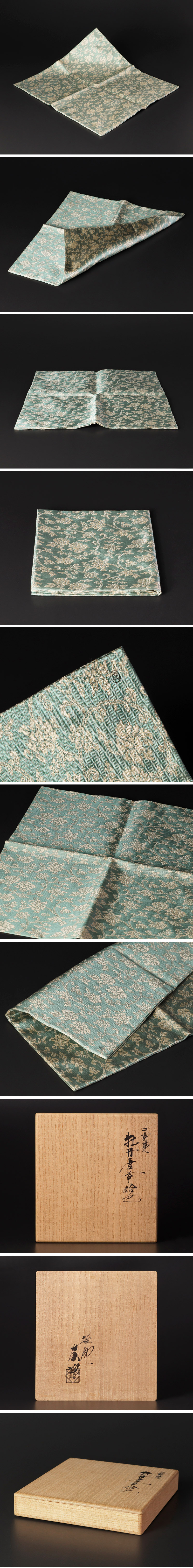 二重蔓牡丹唐草は、名物裂の一つ。二重に巡る唐草に牡丹花文を配した意匠で、野村紹巴愛用の織物に由来する「紹巴裂」に属します。しなやかでやわらかな風合いも魅力のひとつです。 薄水色とも淡い黄緑とも言い切れない、名状しがたい柔らかな色合い。光の加減によってほのかに表情を変え、土田友湖ならではの静かな気品が漂う服紗です。 ★商品は土田友湖の作品である事を保証致します。 |