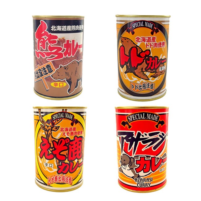 | 原材料名 | 【トドカレー】 原材料:カレールウ、野菜(たまねぎ、にんじん)、トド肉、カレー粉、砂糖、小麦粉、 コーン油、こしょう、調味料(アミノ酸等)、カラメル色素、増粘剤(グアーガム)、 乳化剤、酸味料、香料、香辛料、(原材料の一部に乳を含む) 【アザラシカレー】 原材料:カレールウ、野菜(たまねぎ、にんじん)、アザラシ肉、カレー粉、砂糖、小麦粉、コーン油、こしょう、調味料(アミノ酸等)、カラメル色素、増粘剤(グァーガム)、乳化剤、酸味料、香料、香辛料、(原材料の一部に乳を含む) 【熊カレー】 原材料:カレールウ(小麦粉、牛脂、砂糖、豚脂、カレー粉、食塩、その他)、野菜(たまねぎ、にんじん)、熊肉、カレー粉、砂糖、小麦粉、コーン油、こしょう、調味料(アミノ酸等)、カラメル色素、増粘多糖類、乳化剤、酸味料、香料、香辛料抽出物、(原材料の一部に乳を含む) 【えぞ鹿カレー】 原材料:カレールウ、野菜(たまねぎ、にんじん)、えぞ鹿肉、カレー粉、砂糖、小麦粉、コーン油、こしょう、調味料(アミノ酸等)、カラメル色素、増粘剤(グァーガム)、乳化剤、酸味料、香料、香辛料、(原材料の一部に乳を含む | ||