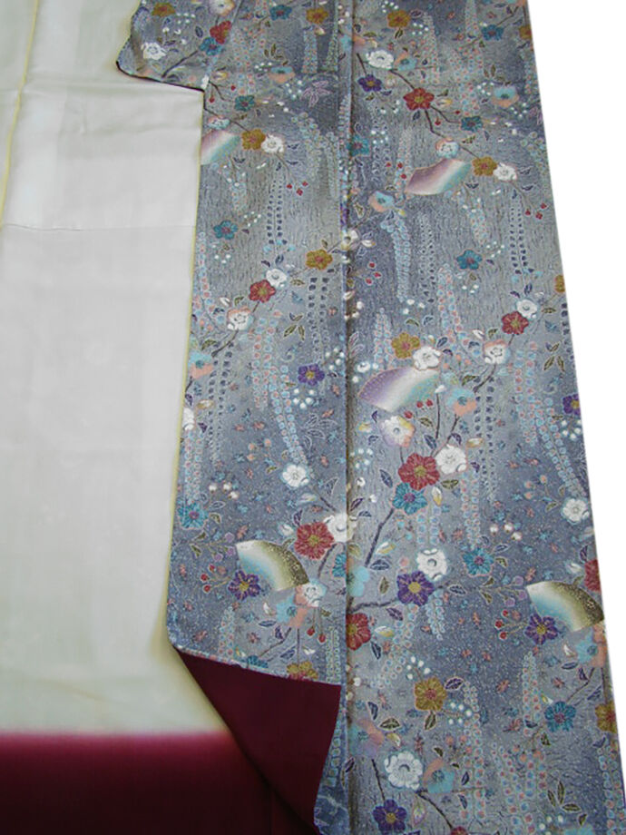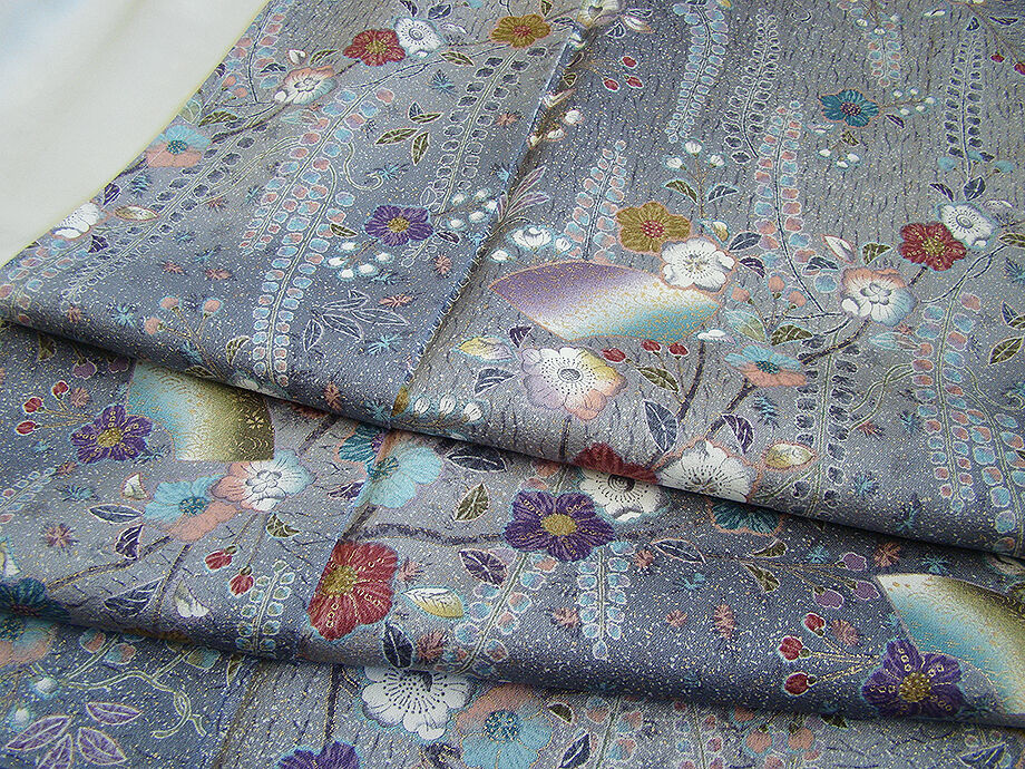 | 商品説明 | こちらのお品は「袷」ですので10月から5月までお召頂ければと思います。 とてもしなやかなさらりとした手触りの着心地良い重めのちりめん地の生地、 灰色の濃淡色地に黄土、珊瑚、赤紫、水色等の花草、地紙文の染柄に金彩加工仕立て、 八掛は蒲萄色(正絹)、幅広い年代の方にお召頂けます。 |
