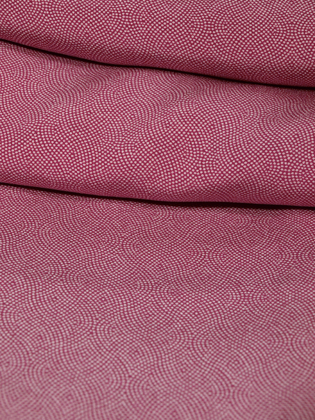 真紅(しんく)色の地に、立涌(たてわく)の文様が染め抜かれている縮緬の江戸小紋です。袷仕立てです。 鮫小紋のような趣きであらわされた立涌の意匠にめずらしさが感じられます。小粋で優美なお色目です。とてもなめらかでやわらかな手ざわりの最上質の縮緬地です。 ユーズド品と思われますが、しみやよごれ、褪色などのダメージは見あたらず、たいへんきれいな状態です。 |